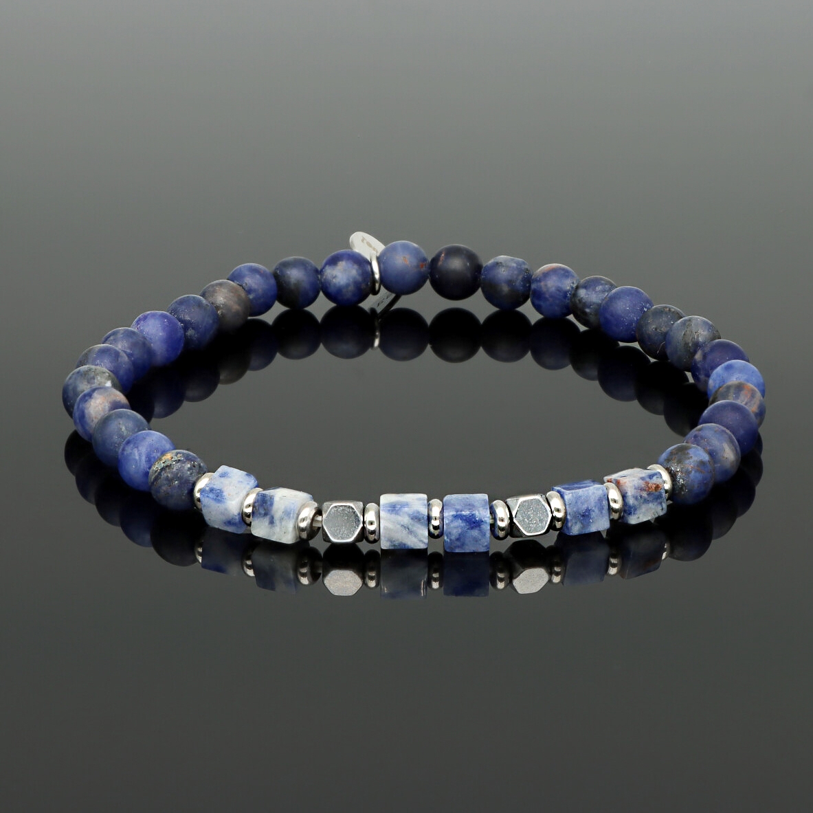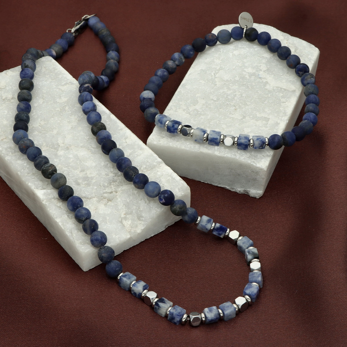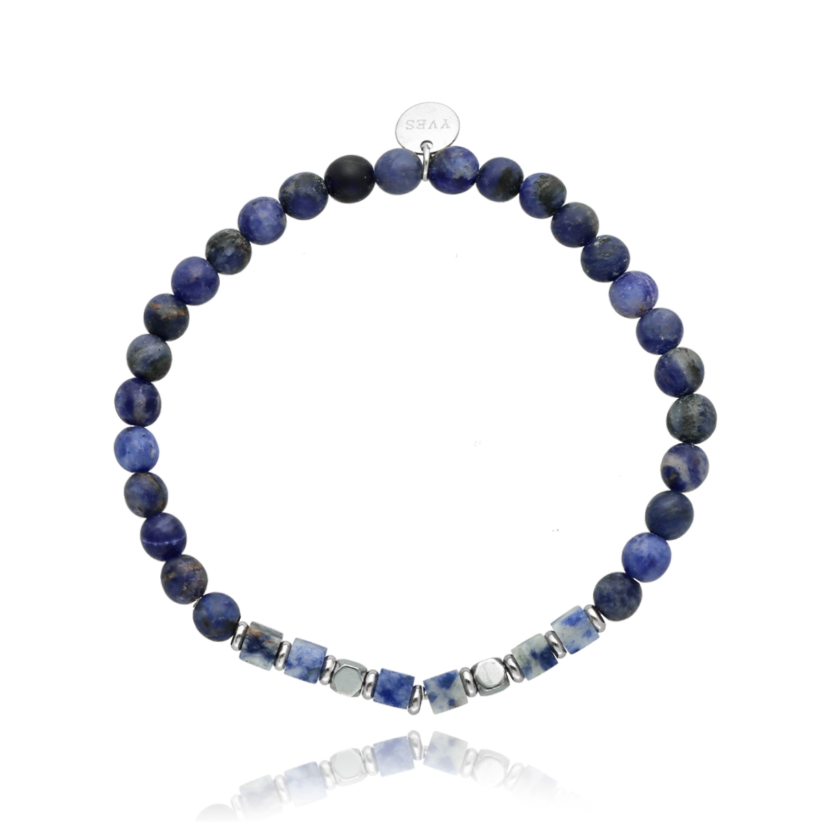 Bransoletka męska YVES wykonana z naturalnych kamieni – sodalitu – zestawionych ze stalą szlachetną. Osadzona na wytrzymałych, elastycznych gumkach, dzięki czemu dopasowuje się do każdego nadgarstka. W pełni antyalergiczna, komfortowa w noszeniu. Bransoletka pakowana w eleganckie pudełko, idealna zarówno na co dzień, jak i w formie prezentu. Stanowi komplet z naszyjnikiem o tym samym indeksie.