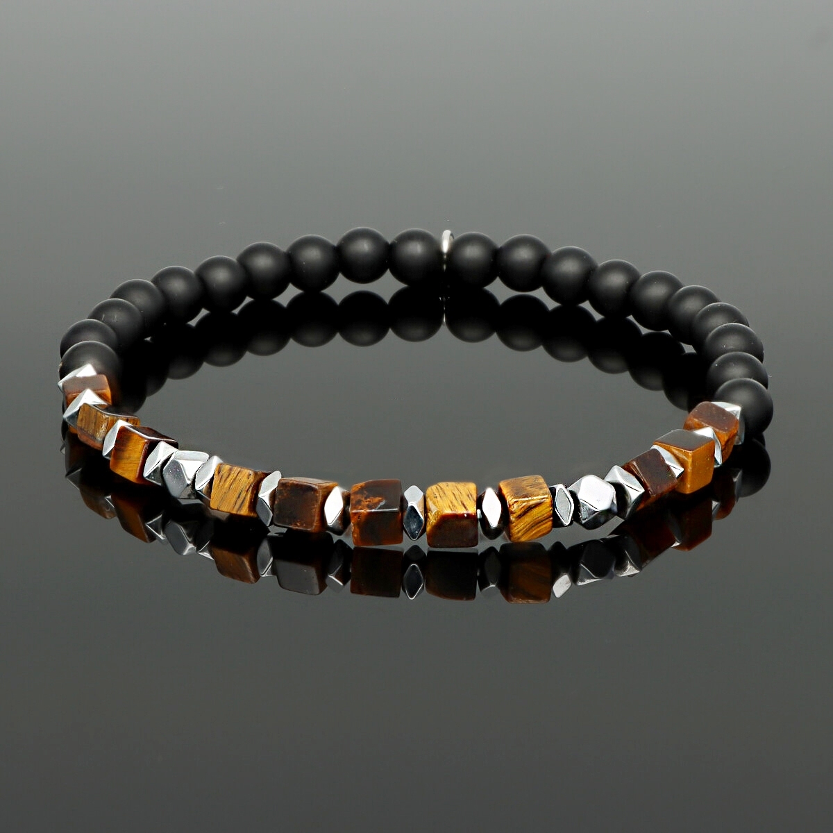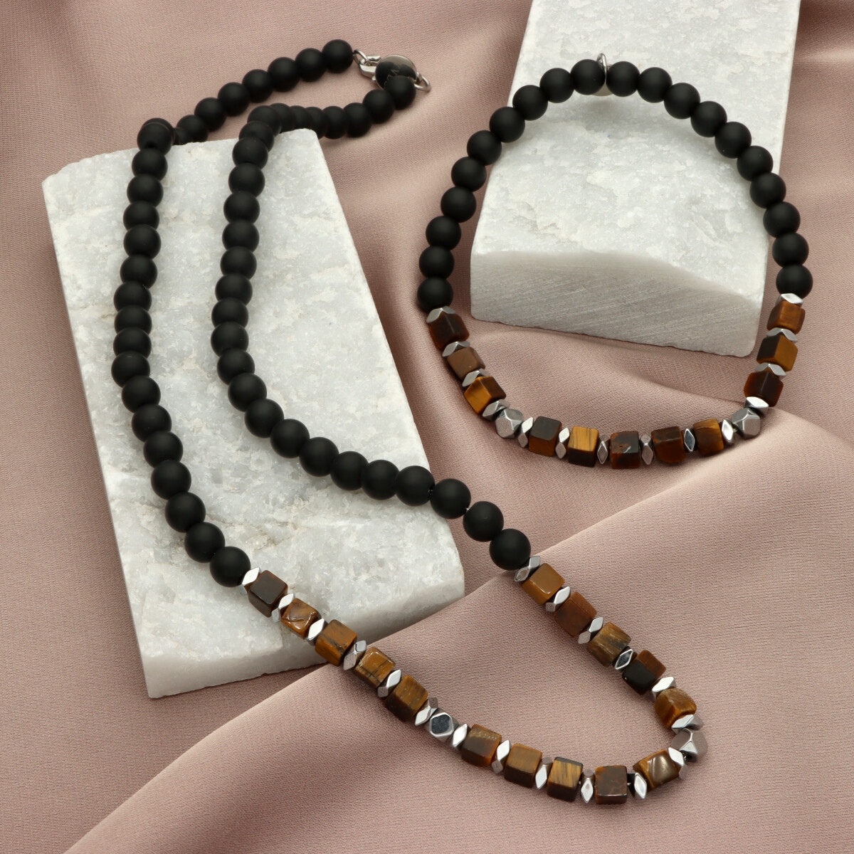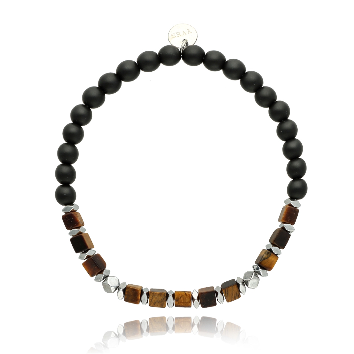 Bransoletka męska YVES wykonana z naturalnych kamieni – tiger eye i agatu – zestawionych ze stalą szlachetną. Osadzona na wytrzymałych, elastycznych gumkach, dzięki czemu dopasowuje się do każdego nadgarstka. W pełni antyalergiczna, komfortowa w noszeniu. Bransoletka pakowana w eleganckie pudełko, idealna zarówno na co dzień, jak i w formie prezentu. Stanowi komplet z naszyjnikiem o tym samym indeksie.