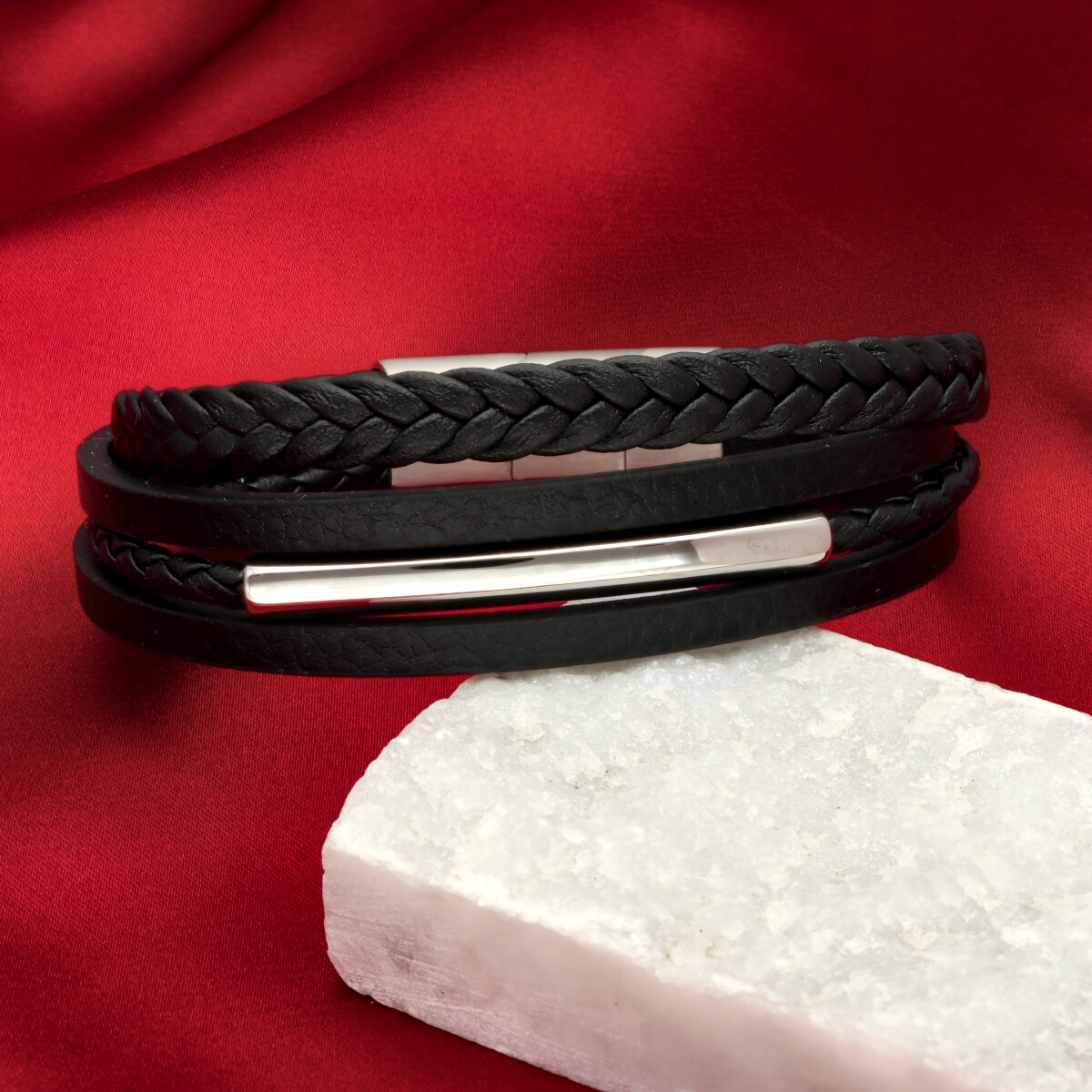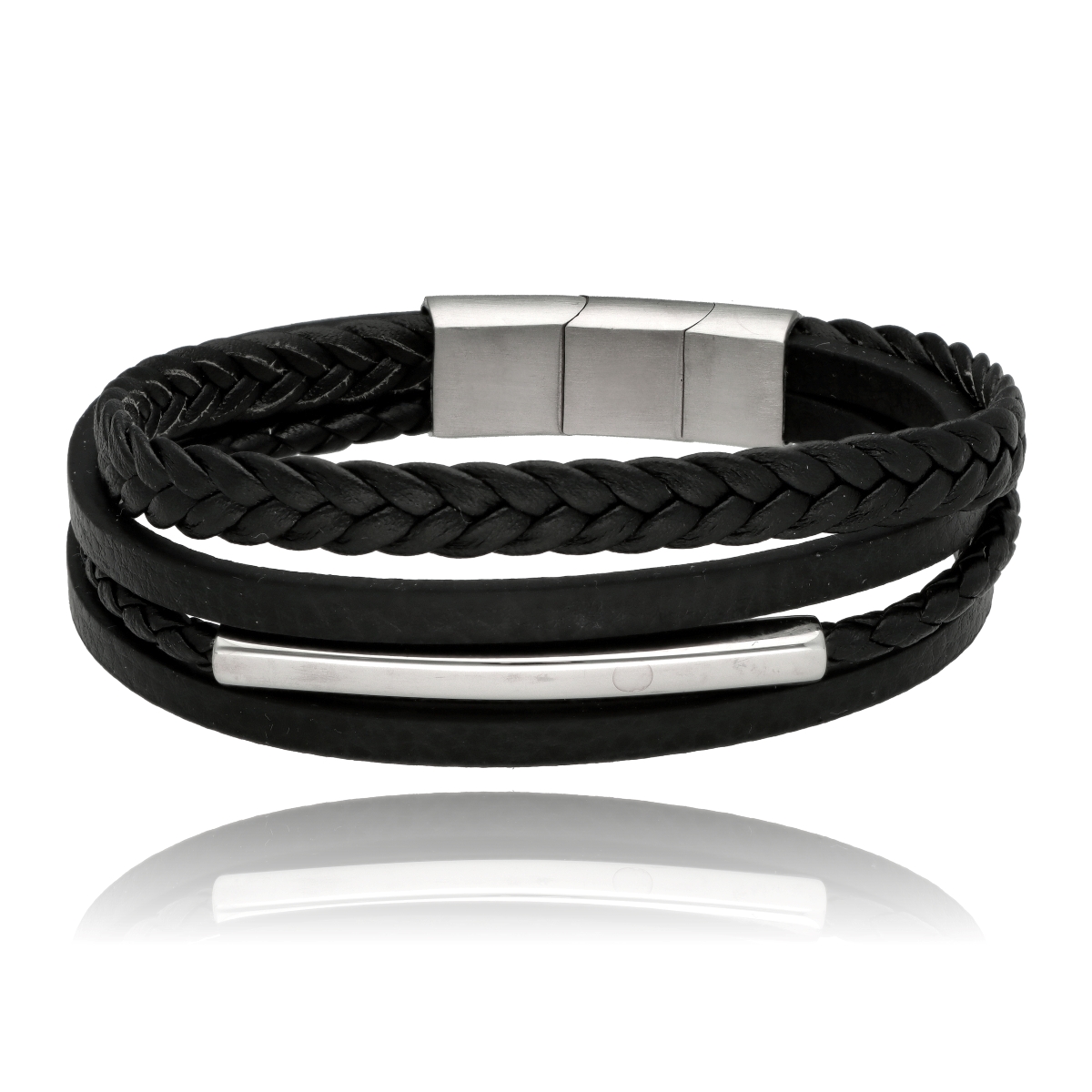 Męska bransoleta wykonana z naturalnej skóry oraz stali szlachetnej 316L, odpornej na uszkodzenia i hipoalergicznej. Prosty, nowoczesny design sprawia, że pasuje zarówno na co dzień, jak i do bardziej eleganckich stylizacji.