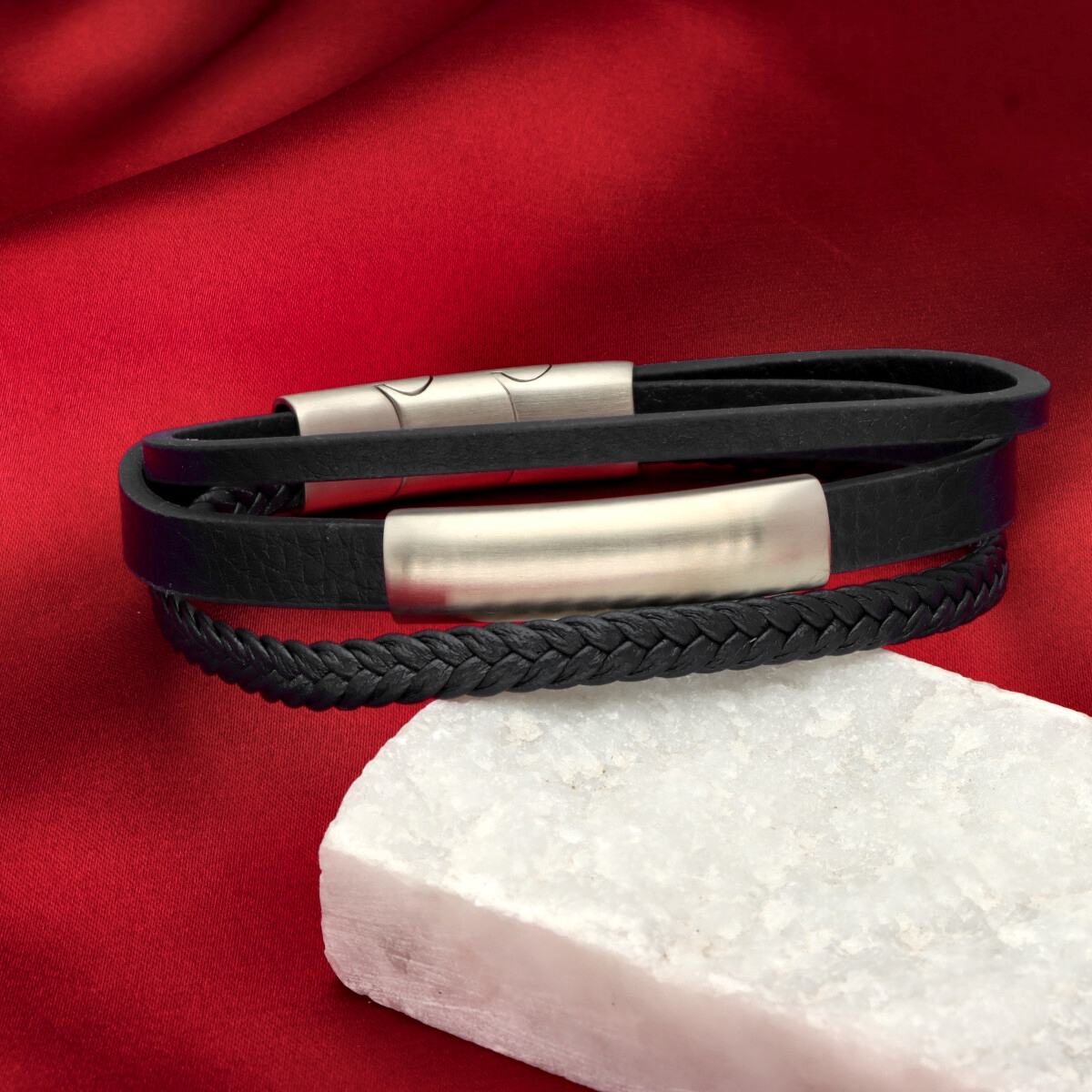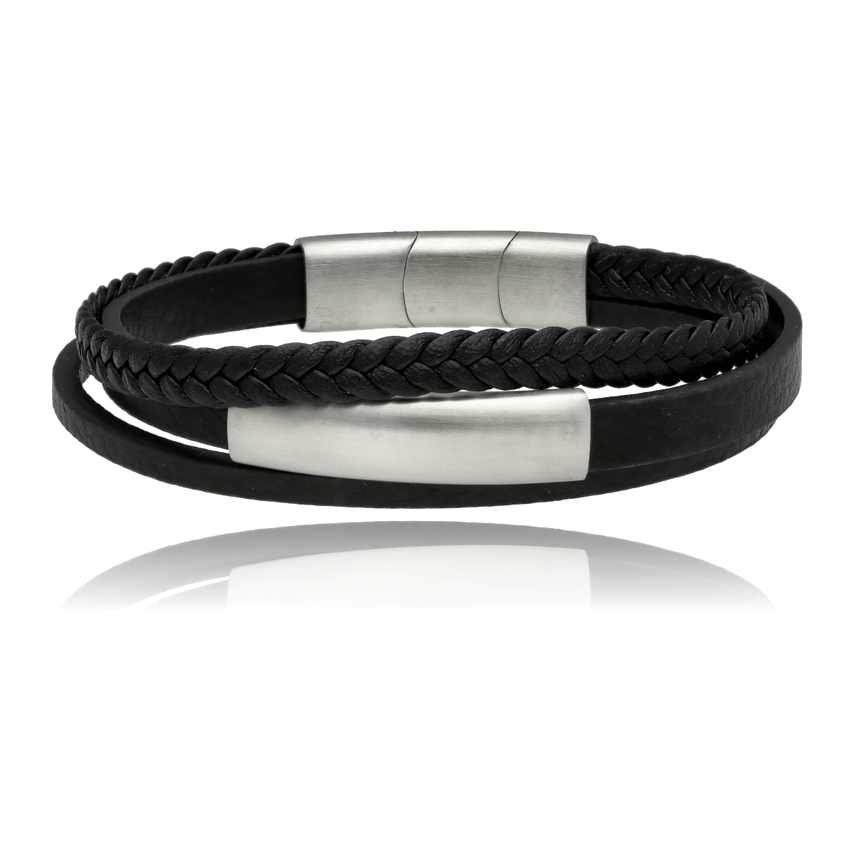 Męska bransoleta wykonana z naturalnej skóry oraz stali szlachetnej 316L, odpornej na uszkodzenia i hipoalergicznej. Prosty, nowoczesny design sprawia, że pasuje zarówno na co dzień, jak i do bardziej eleganckich stylizacji.