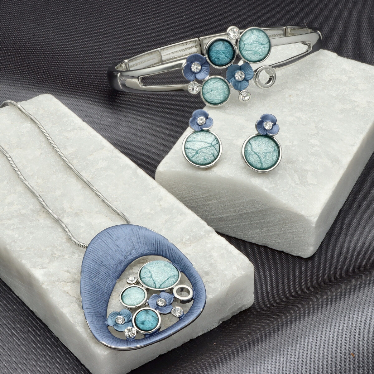 Elegancka bransoletka wykonana z metalu, żywicy jubilerskiej i emalii. Rozmiar uniwersalny (na rozciągliwych gumkach). Szukaj do kompletu naszyjnika i kolczyków o tym samym indeksie numerycznym.