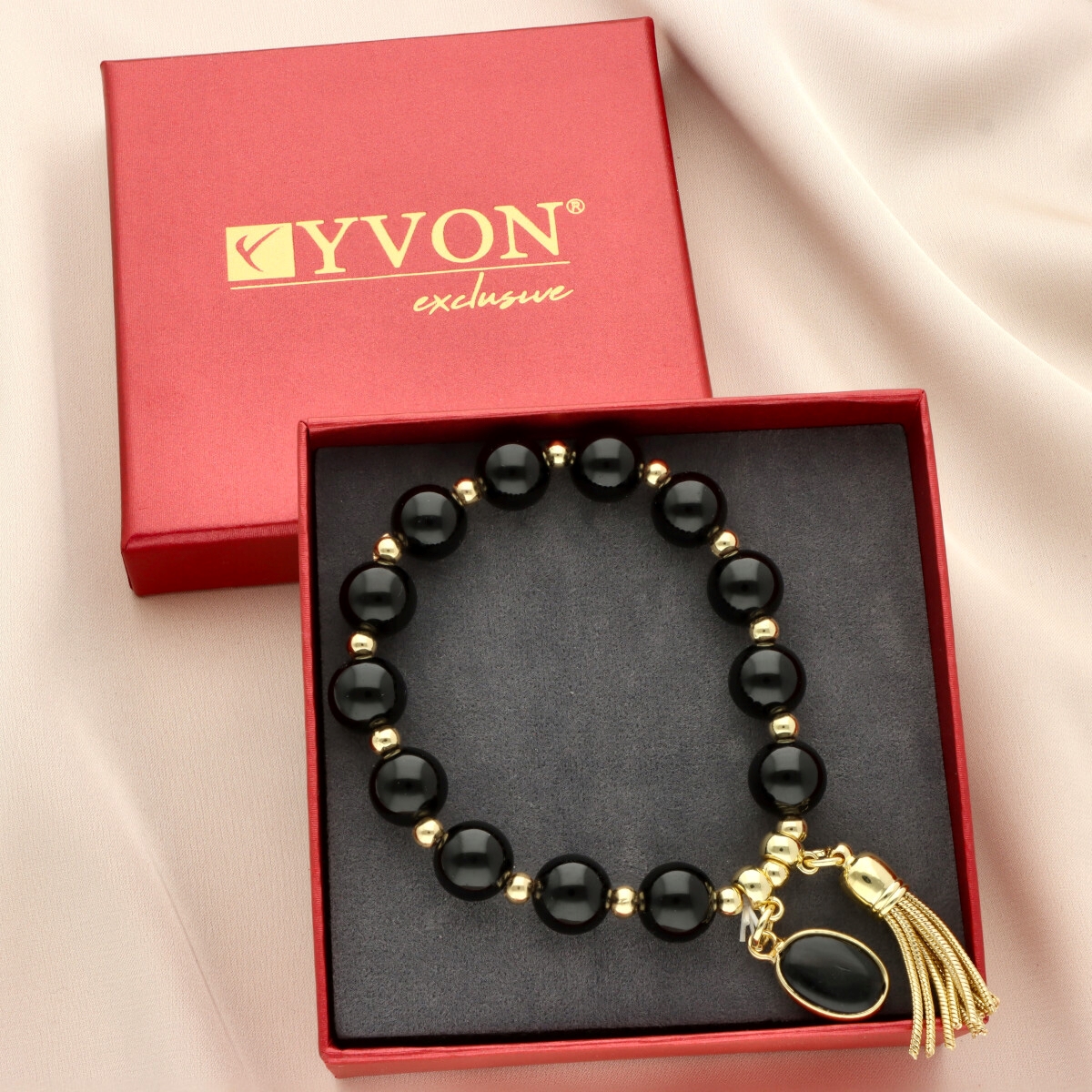 Model wykonany na elastycznej gumce, dzięki czemu dopasowuje się do nadgarstka i zapewnia wygodę noszenia. Elementy metalowe wykonane z hipoalergicznego mosiądzu podkreślają szlachetny charakter biżuterii.