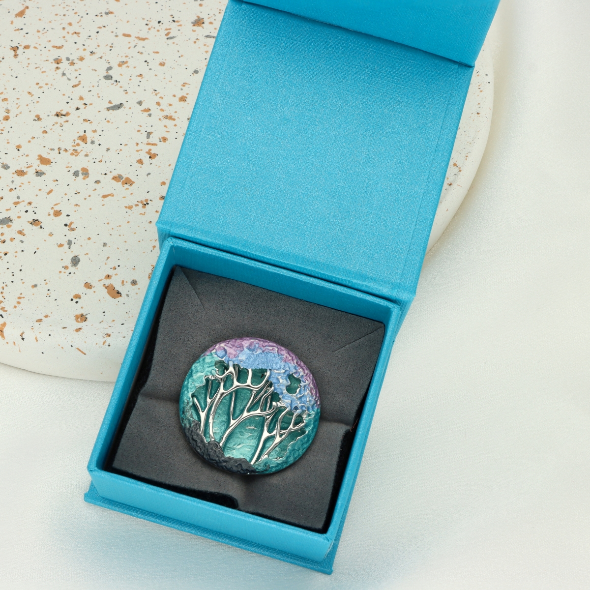 Broszka na magnes wykonana w konwencji biżuterii artystycznej. Ręcznie emaliowana. Całość wykonana z antyalergicznego metalu. W eleganckim pudełku. Szukaj do kompletu naszyjnika, kolczyków i bransoletki o tym samym indeksie numerycznym.