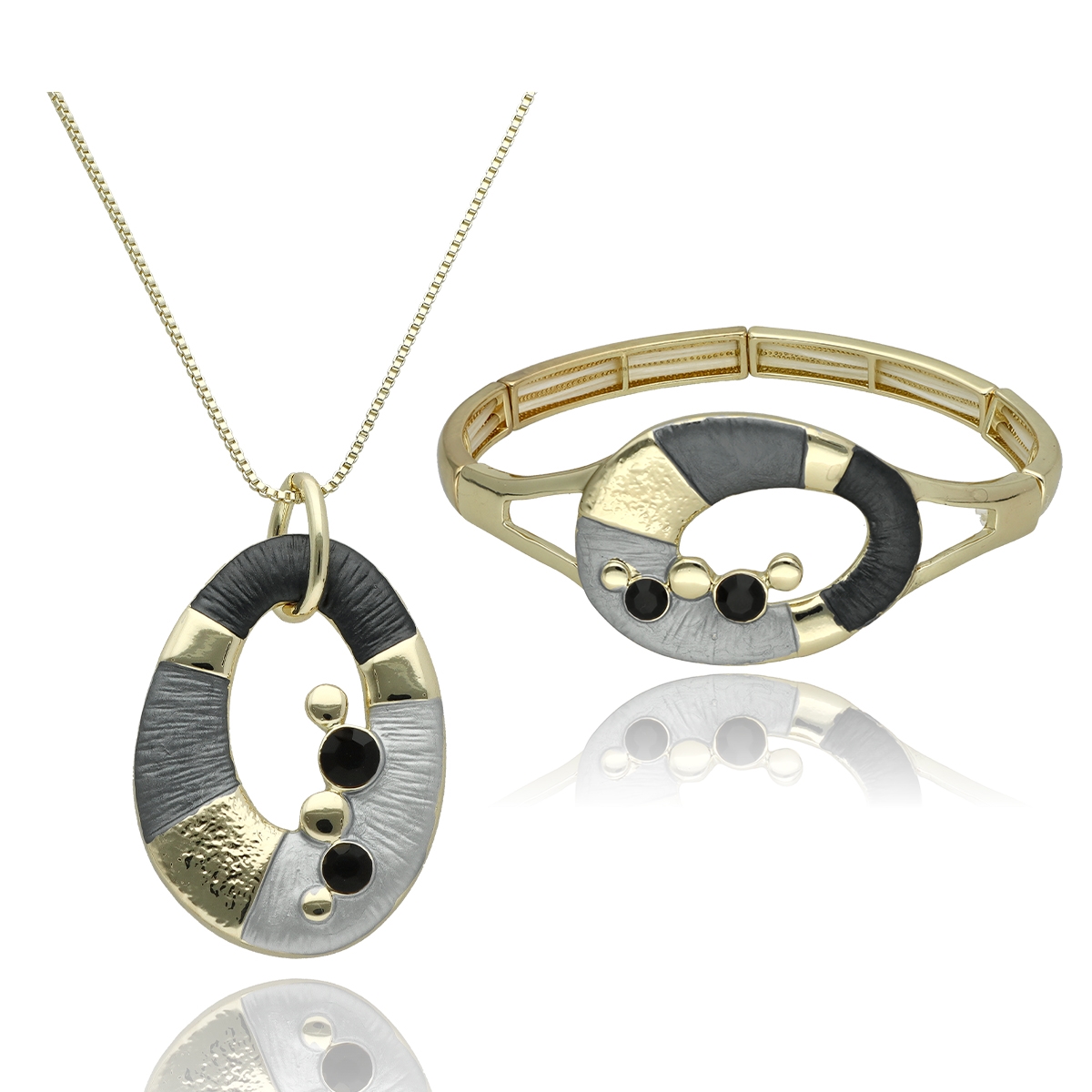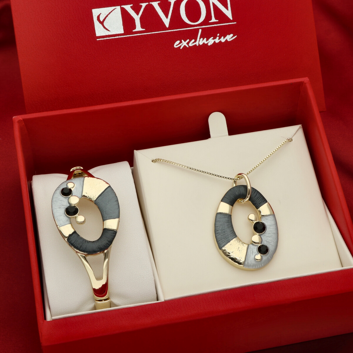 Zestaw biżuterii Ardenne z kolekcji YVON Exclusive to połączenie nowoczesnego designu z jubilerską precyzją wykonania. Geometryczne, owalne elementy zdobione emalią i drobnymi cyrkoniami tworzą dekoracyjną kompozycję o subtelnym blasku i ponadczasowej elegancji. Każdy detal zachwyca dopracowaniem i lekkością formy. Komplet wykonany jest z wysokiej jakości metalu hipoalergicznego (zamak), który gwarantuje trwałość, komfort i bezpieczeństwo noszenia. Naszyjnik ma długość 45 cm + 8 cm regulacja, natomiast bransoletka posiada rozmiar uniwersalny – wykonana jest na rozciągliwych, elastycznych gumkach, które zapewniają wygodne dopasowanie do nadgarstka. Całość zaprezentowana jest w luksusowym, czerwonym pudełku prezentowym.