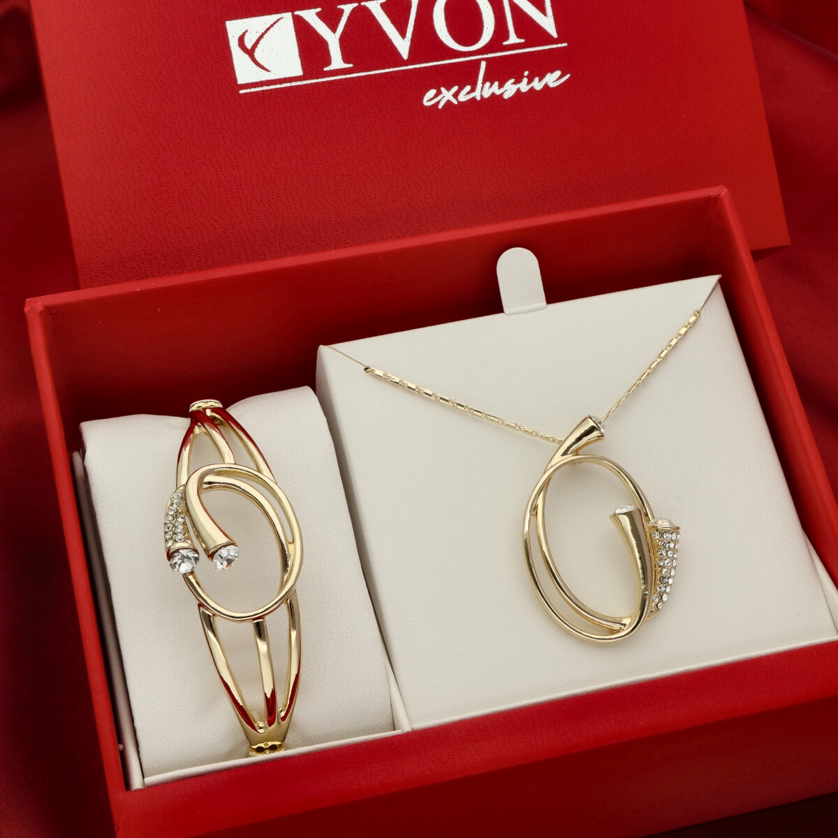 Zestaw biżuterii Aveline z kolekcji YVON Exclusive to wyjątkowe połączenie prostoty formy i biżuteryjnego wyrafinowania. Delikatnie przeplatające się linie metalu tworzą nowoczesną kompozycję, subtelnie ozdobioną połyskującymi cyrkoniami. To biżuteria o eleganckim charakterze, idealna zarówno do codziennych, jak i wieczorowych stylizacji. Komplet wykonany jest z wysokiej jakości metalu hipoalergicznego (zamak), odpornego na utratę koloru i zapewniającego pełen komfort noszenia. Naszyjnik ma długość 45 cm + 8 cm regulacja, natomiast bransoletka posiada rozmiar uniwersalny – wykonana na rozciągliwych, elastycznych gumkach, dopasowuje się do nadgarstka z lekkością i wygodą. Całość zapakowana jest w efektowne, czerwone pudełko prezentowe YVON, które podkreśla ekskluzywny charakter biżuterii i sprawia, że komplet prezentuje się wyjątkowo elegancko jako prezent.