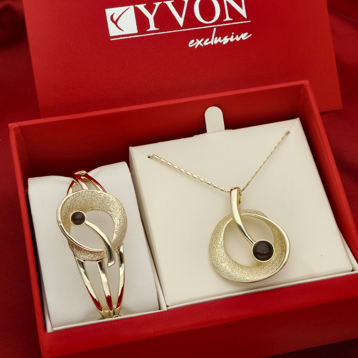 Zestaw biżuterii Eloria z kolekcji YVON Exclusive to elegancki komplet wykonany z wysokiej jakości zamaku – hipoalergicznego stopu metali stosowanego w jubilerstwie. Subtelne elementy ozdobne uzupełnia naturalny kamień kwarcu, który dodaje całości szlachetnego charakteru. Lekko matowa, szczotkowana powierzchnia metalu pięknie kontrastuje z gładkim połyskiem detali, tworząc nowoczesny, a zarazem ponadczasowy efekt. Biżuteria jest w 100% hipoalergiczna, nie zawiera niklu, kadmu ani ołowiu. Naszyjnik ma długość 45 cm + 8 cm regulacja, natomiast bransoletka jest rozchylana, co umożliwia wygodne dopasowanie do nadgarstka. Zestaw zaprezentowany jest w eleganckim, czerwonym pudełku prezentowym YVON, które jest gratis.