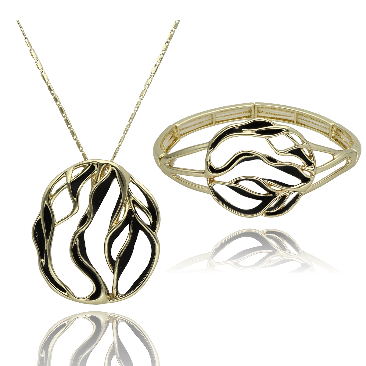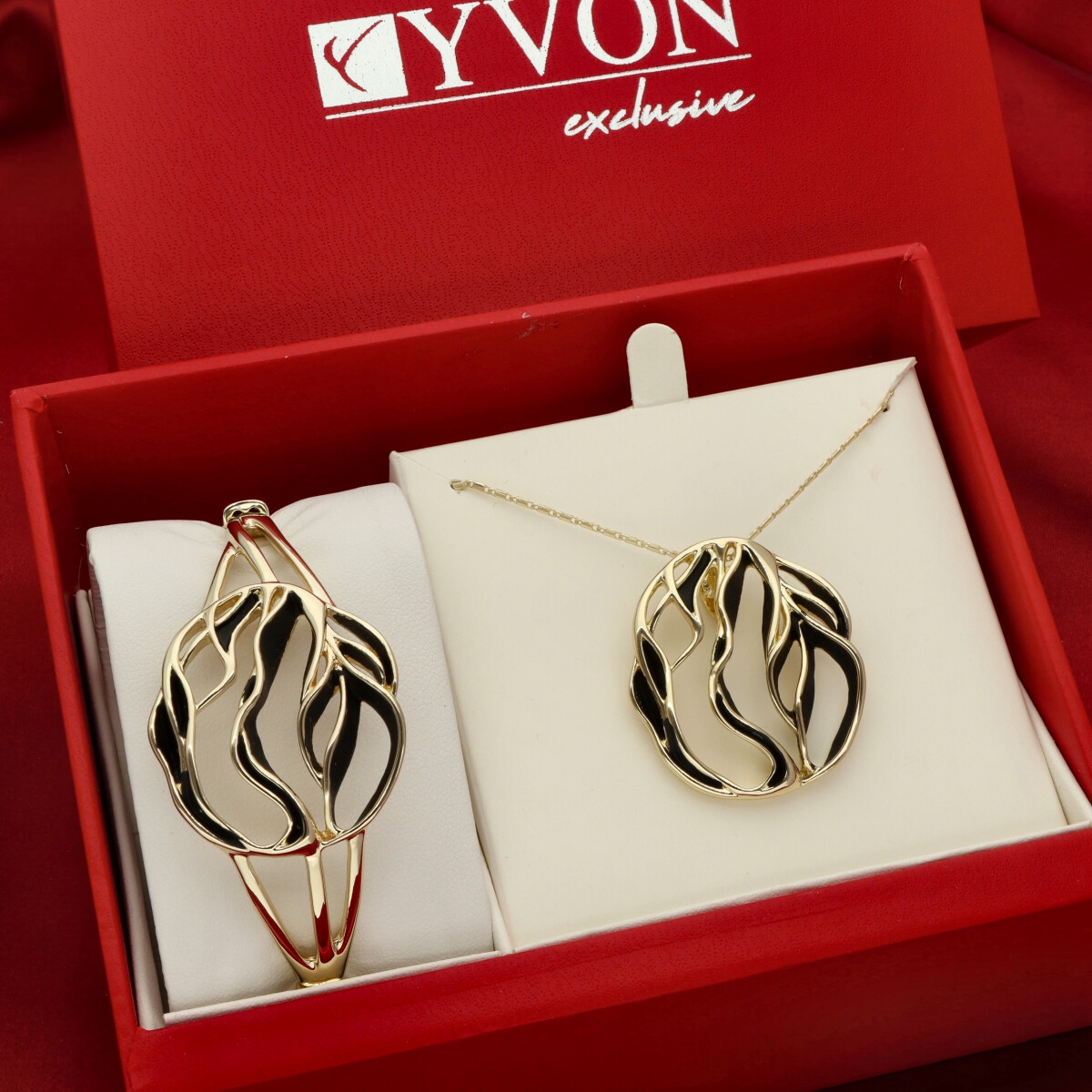 Zestaw biżuterii Flamelle z kolekcji YVON Exclusive zachwyca formą inspirowaną płynnym ruchem płomieni. Falujące linie metalu wypełnione czarną emalią tworzą efektowną, artystyczną kompozycję o nowoczesnym charakterze. To biżuteria pełna wyrazu – subtelna, a jednocześnie przyciągająca uwagę elegancją i niebanalnym designem. Komplet wykonany jest z wysokiej jakości metalu hipoalergicznego (zamak), który zapewnia trwałość, komfort i bezpieczeństwo noszenia. Naszyjnik ma długość 45 cm + 8 cm regulacja, natomiast bransoletka ma rozmiar uniwersalny – wykonana na rozciągliwych, elastycznych gumkach, dopasowuje się do nadgarstka z lekkością i wygodą. Całość zapakowana jest w efektowne, czerwone pudełko prezentowe YVON, które podkreśla ekskluzywny charakter kolekcji i czyni ten zestaw doskonałym wyborem na elegancki prezent.