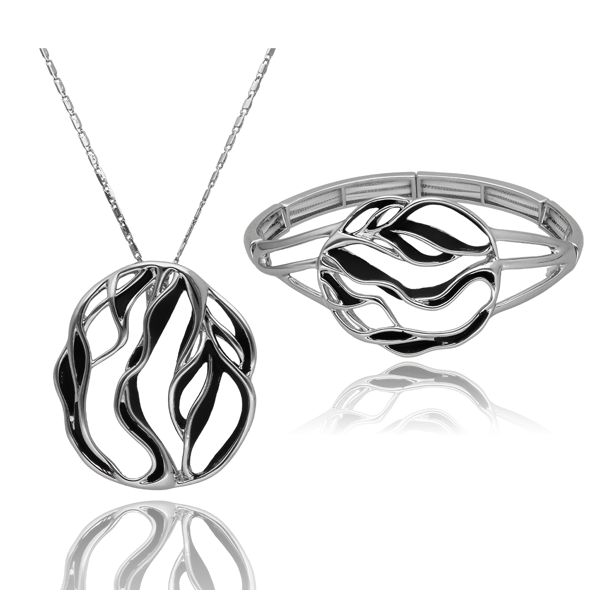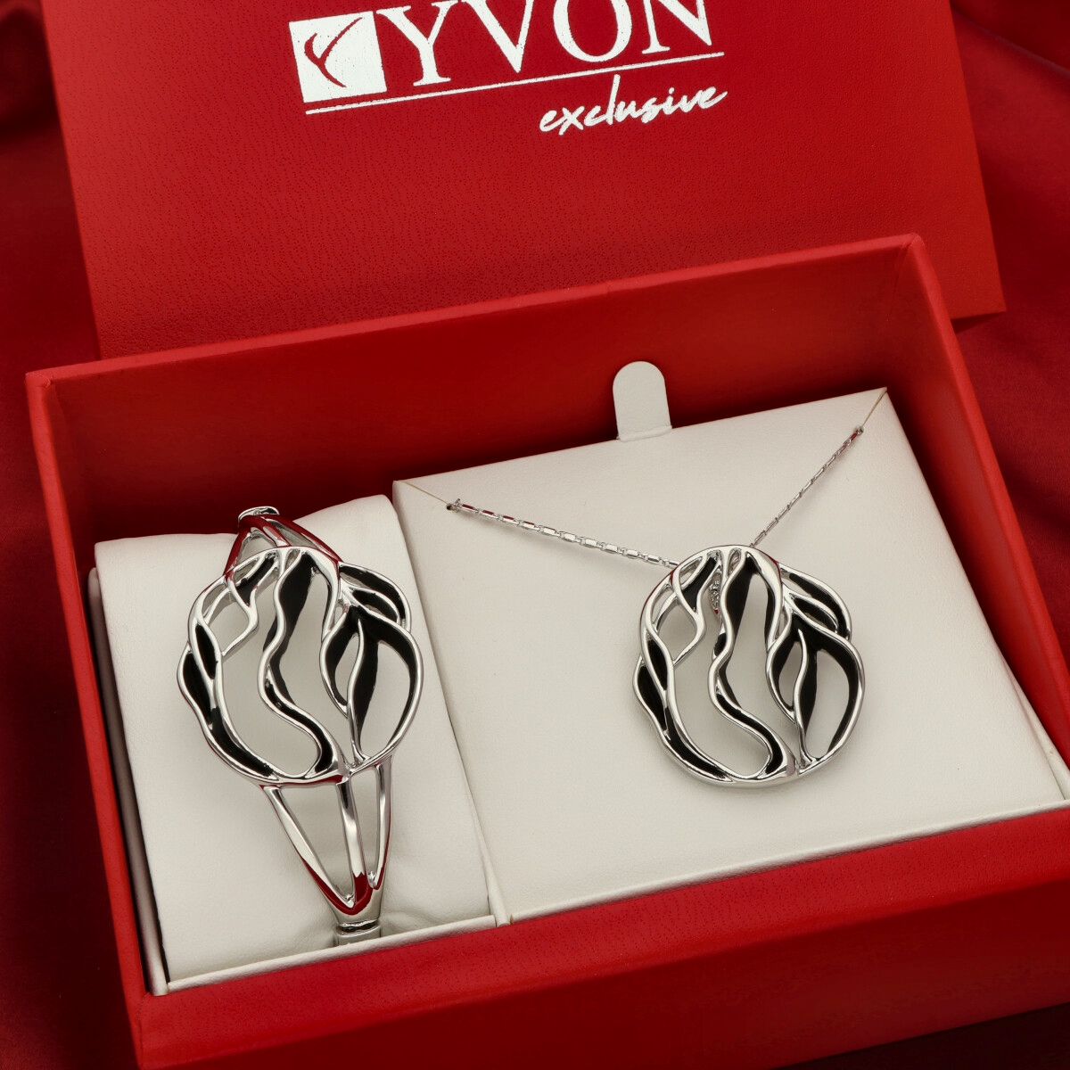 Zestaw biżuterii Flamelle z kolekcji YVON Exclusive zachwyca formą inspirowaną płynnym ruchem płomieni. Falujące linie metalu wypełnione czarną emalią tworzą efektowną, artystyczną kompozycję o nowoczesnym charakterze. To biżuteria pełna wyrazu – subtelna, a jednocześnie przyciągająca uwagę elegancją i niebanalnym designem. Komplet wykonany jest z wysokiej jakości metalu hipoalergicznego (zamak), który zapewnia trwałość, komfort i bezpieczeństwo noszenia. Naszyjnik ma długość 45 cm + 8 cm regulacja, natomiast bransoletka ma rozmiar uniwersalny – wykonana na rozciągliwych, elastycznych gumkach, dopasowuje się do nadgarstka z lekkością i wygodą. Całość zapakowana jest w efektowne, czerwone pudełko prezentowe YVON, które podkreśla ekskluzywny charakter kolekcji i czyni ten zestaw doskonałym wyborem na elegancki prezent.