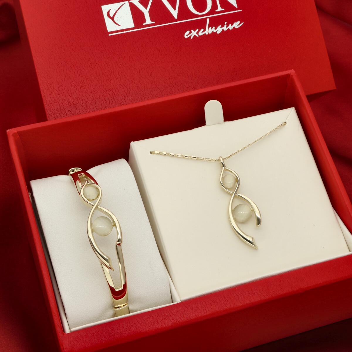 Zestaw biżuterii Lumina z kolekcji YVON Exclusive to elegancki komplet składający się z naszyjnika i bransoletki wykonanych z kwarcu oraz antyalergicznego stopu metali – zamaku. Zamak to trwały materiał jubilerski o wysokiej odporności na korozję i zachowanie połysku. Wszystkie elementy zostały starannie wykończone i zaprezentowane w dużym, czerwonym pudełku prezentowym YVON. Biżuteria jest w 100% antyalergiczna i bezpieczna dla skóry. Naszyjnik ma długość 45 cm + 8 cm regulacja, bransoletka posiada rozmiar uniwersalny na elastycznych gumkach, dopasowujących się do każdej ręki. Dekoracyjne pudełko prezentowe YVON jest gratis.