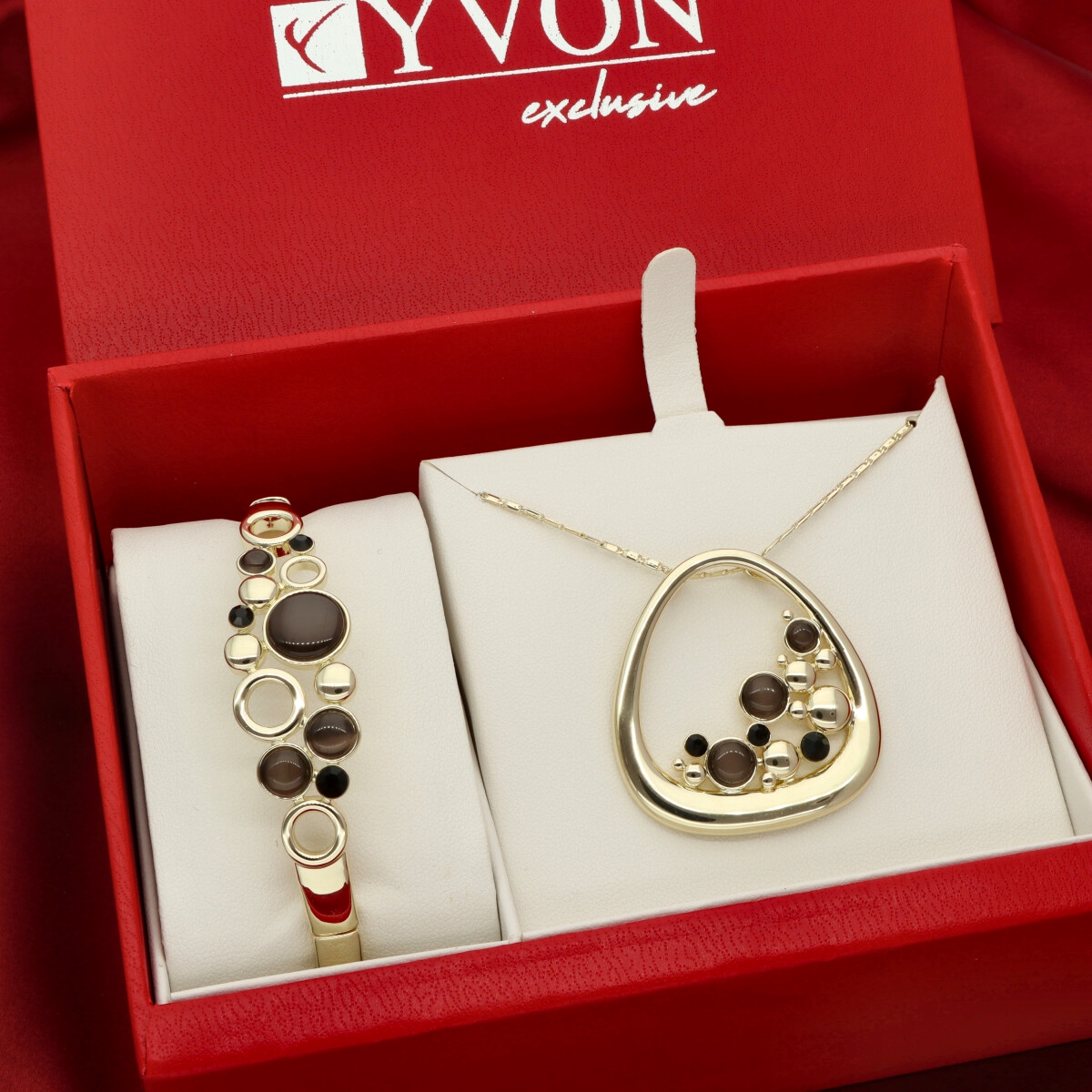 Zestaw biżuterii Lumina z kolekcji YVON Exclusive to elegancki komplet składający się z naszyjnika i bransoletki wykonanych z kwarcu oraz antyalergicznego stopu metali – zamaku. Zamak to trwały materiał jubilerski o wysokiej odporności na korozję i zachowanie połysku. Wszystkie elementy zostały starannie wykończone i zaprezentowane w dużym, czerwonym pudełku prezentowym YVON. Biżuteria jest w 100% antyalergiczna i bezpieczna dla skóry. Naszyjnik ma długość 45 cm + 8 cm regulacja, bransoletka posiada rozmiar uniwersalny na elastycznych gumkach, dopasowujących się do każdej ręki. Dekoracyjne pudełko prezentowe YVON jest gratis.