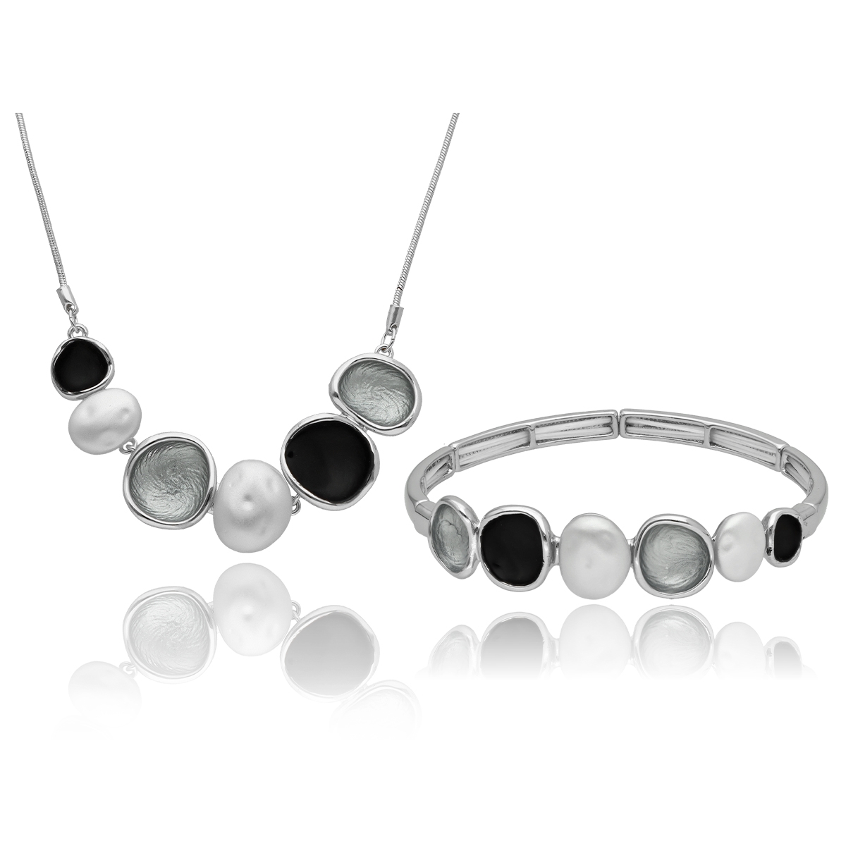 Zestaw biżuterii YVON Exclusive składający się z naszyjnika i bransoletki wykonanych z wysokiej jakości materiałów. Elementy ozdobne tworzy połączenie perły Shell oraz ręcznie nanoszonej emalii, umieszczonych w eleganckiej metalowej oprawie. Całość utrzymana w klasycznym stylu, doskonale sprawdzi się jako prezent na każdą okazję, zwłaszcza w sezonie świątecznym. Biżuteria jest w 100% antyalergiczna, nie zawiera niklu, kadmu ani ołowiu. Naszyjnik ma długość 45 cm + 8 cm regulacja, bransoletka posiada rozmiar uniwersalny na elastycznych gumkach, dzięki czemu dopasowuje się do nadgarstka. Dekoracyjne czerwone pudełko prezentowe YVON jest gratis.