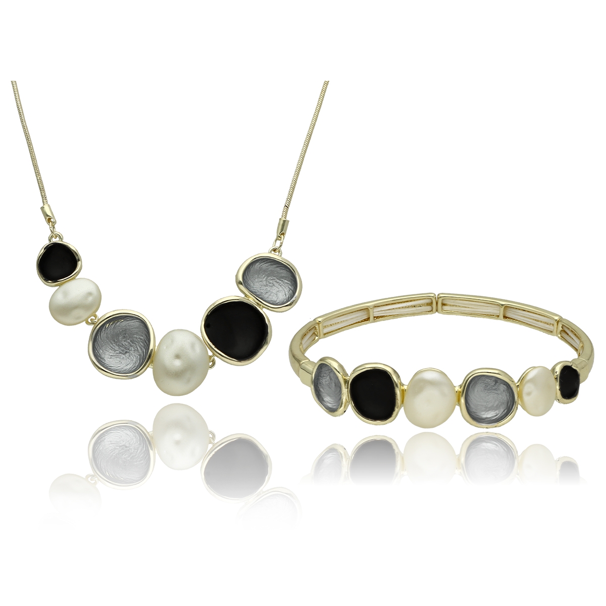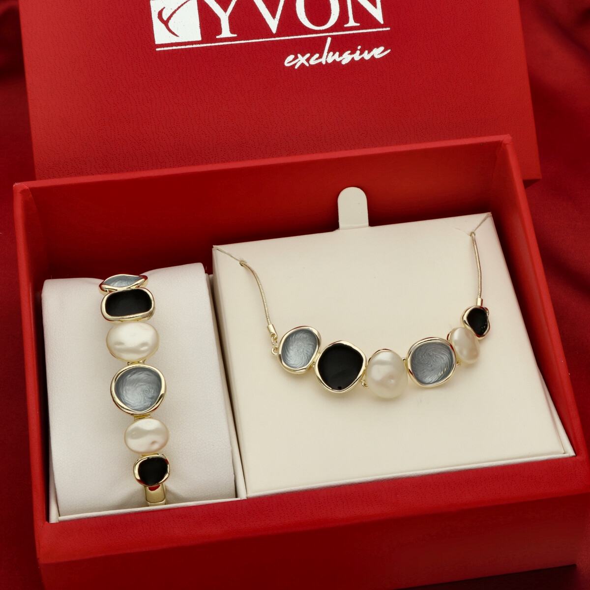 Zestaw biżuterii YVON Exclusive składający się z naszyjnika i bransoletki wykonanych z wysokiej jakości materiałów. Elementy ozdobne tworzy połączenie perły Shell oraz ręcznie nanoszonej emalii, umieszczonych w eleganckiej metalowej oprawie. Całość utrzymana w klasycznym stylu, doskonale sprawdzi się jako prezent na każdą okazję, zwłaszcza w sezonie świątecznym.