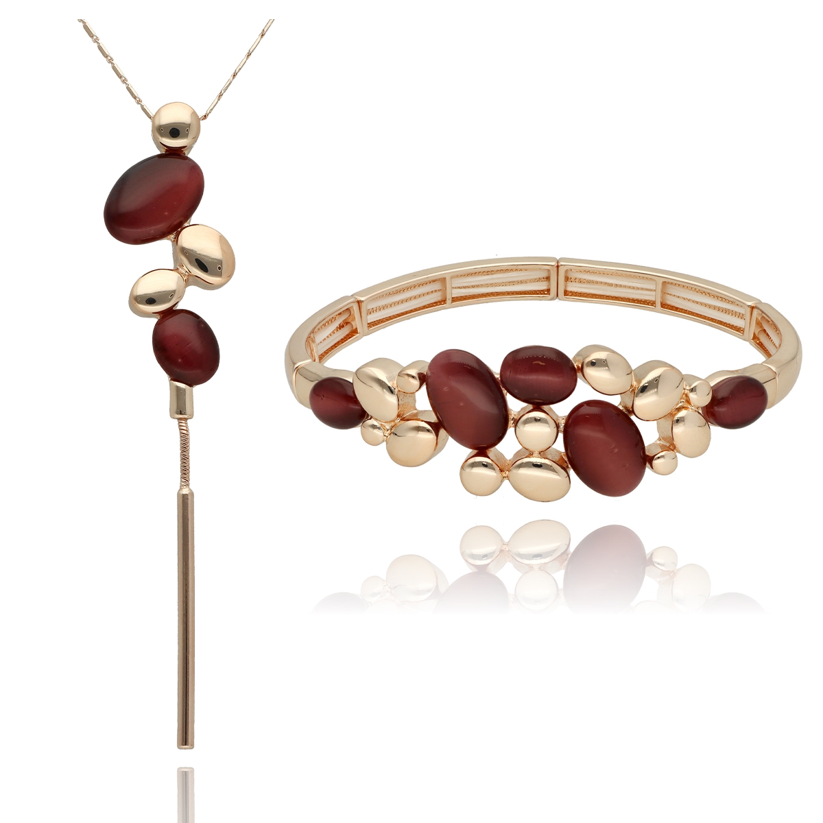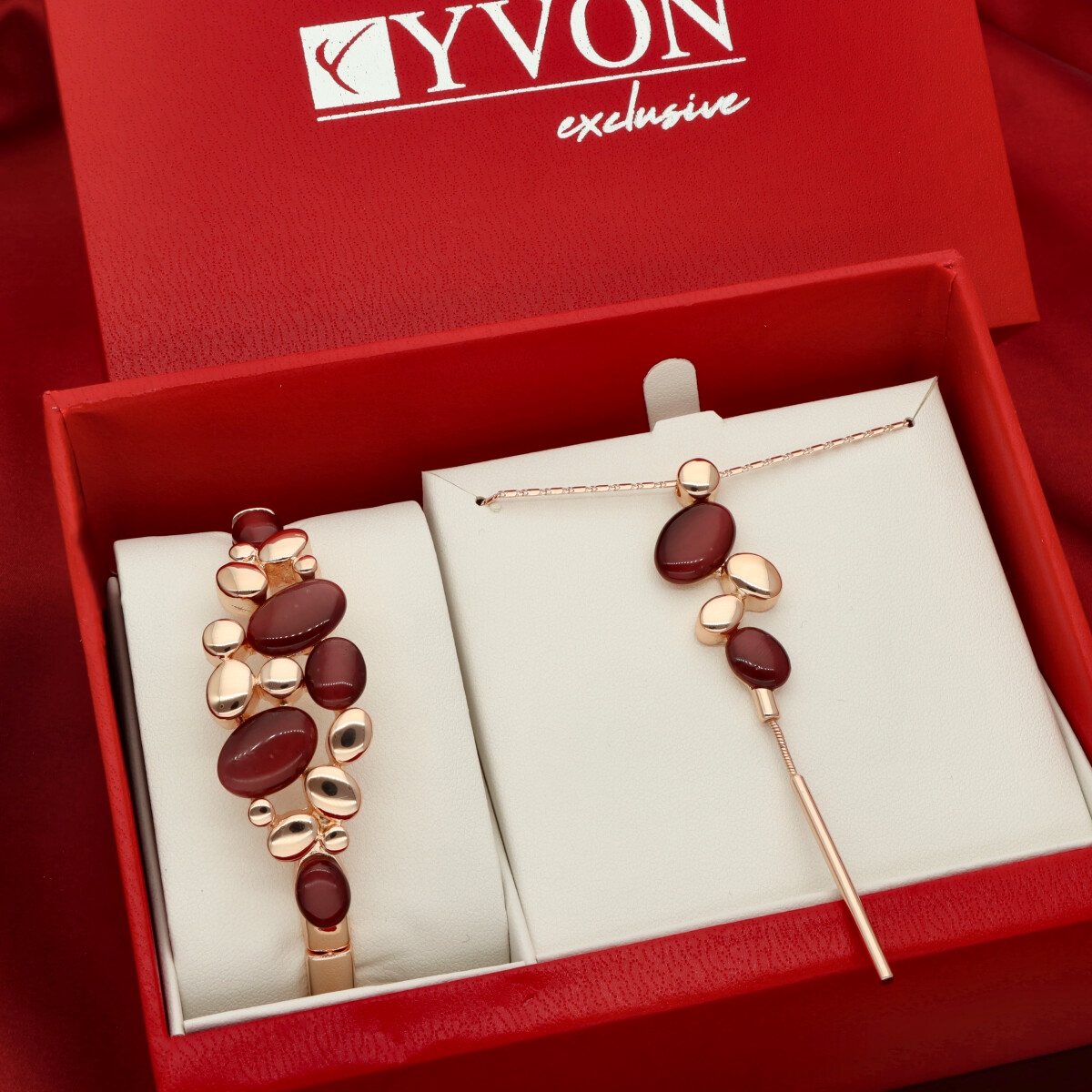 Zestaw biżuterii Lumina z kolekcji YVON Exclusive to elegancki komplet składający się z naszyjnika i bransoletki wykonanych z kwarcu oraz antyalergicznego stopu metali – zamaku. Zamak to trwały materiał jubilerski o wysokiej odporności na korozję i zachowanie połysku. Wszystkie elementy zostały starannie wykończone i zaprezentowane w dużym, czerwonym pudełku prezentowym YVON. Biżuteria jest w 100% antyalergiczna i bezpieczna dla skóry. Naszyjnik ma długość 45 cm + 8 cm regulacja, bransoletka posiada rozmiar uniwersalny na elastycznych gumkach, dopasowujących się do każdej ręki. Dekoracyjne pudełko prezentowe YVON jest gratis.