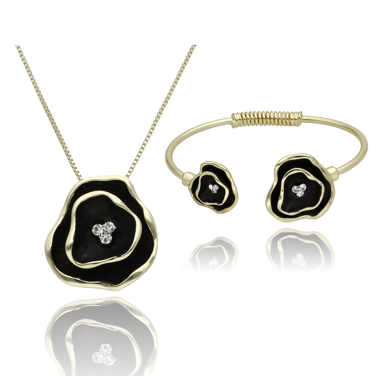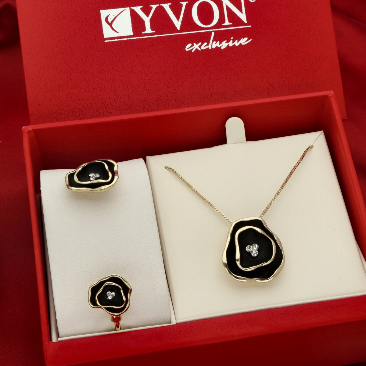 Zestaw biżuterii YVON Exclusive wykonany z wysokiej jakości zamaku pokrytego złotym wykończeniem. Elementy ozdobne zdobi ręcznie nanoszona czarna emalia oraz połyskujące cyrkonie, które podkreślają elegancki charakter kompletu. Każdy detal został starannie wykończony, tworząc efektowną biżuterię o nowoczesnej formie i klasycznym stylu. Biżuteria jest w 100% hipoalergiczna, nie zawiera niklu, kadmu ani ołowiu, dzięki czemu jest bezpieczna dla skóry. Naszyjnik ma długość 45 cm + 8 cm regulacja, natomiast bransoletka jest rozchylana, co ułatwia zakładanie i dopasowanie do nadgarstka. Całość zapakowana jest w eleganckie, czerwone pudełko prezentowe YVON, które jest gratis.