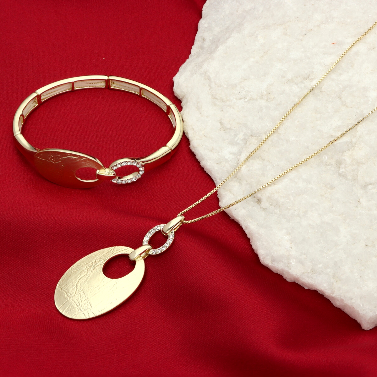Komplet wykonany jest z wysokiej jakości metalu hipoalergicznego (zamak), który zapewnia trwałość, komfort i bezpieczeństwo noszenia. Naszyjnik ma długość 45 cm + 8 cm regulacja, natomiast bransoletka ma rozmiar uniwersalny – wykonana na rozciągliwych, elastycznych gumkach, dopasowuje się do nadgarstka z lekkością i wygodą.