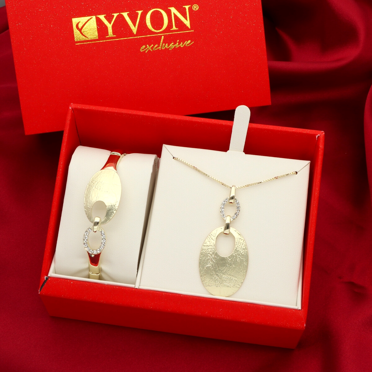 Całość zapakowana jest w efektowne, czerwone pudełko prezentowe YVON, które podkreśla ekskluzywny charakter kolekcji i czyni ten zestaw doskonałym wyborem na elegancki prezent.