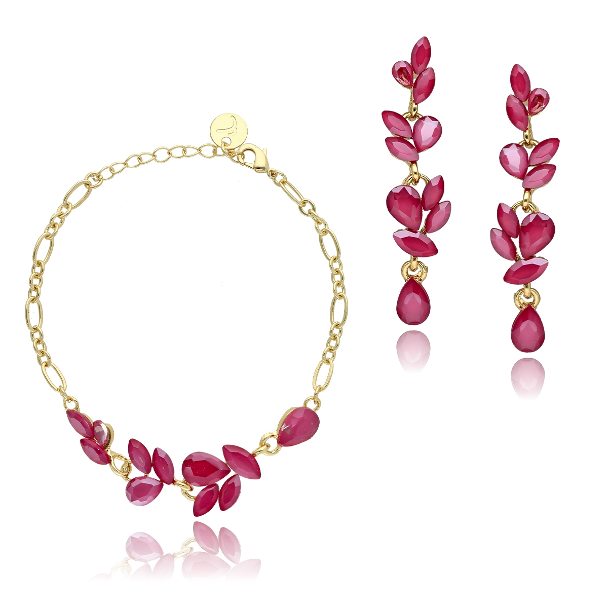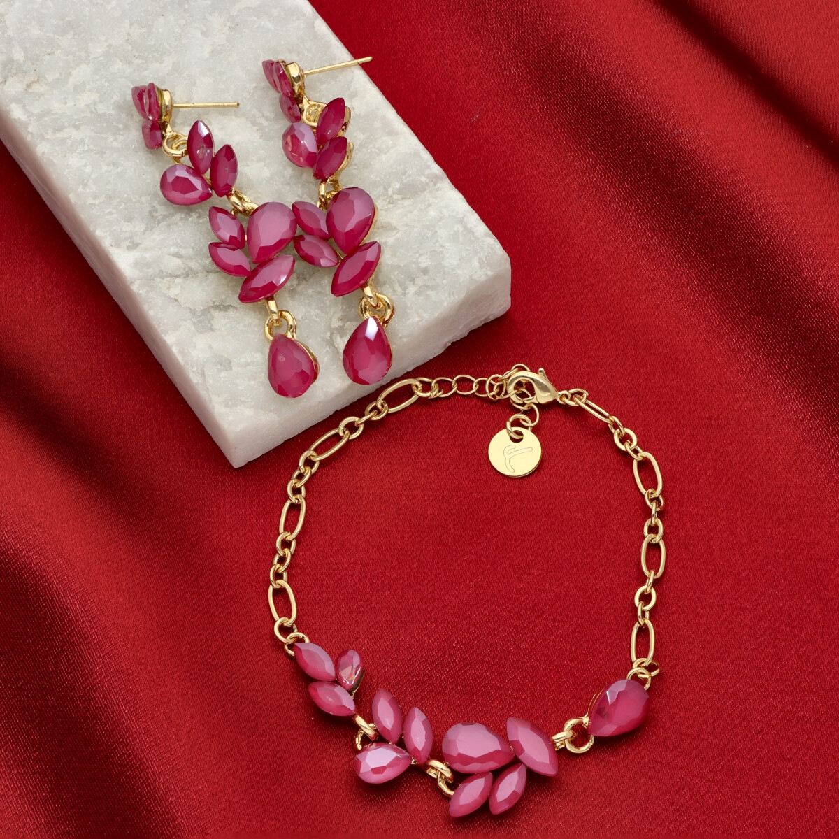 Uroczy, niezwykle kobiecy zestaw biżuterii wizytowej, który subtelnie podkreśla elegancję stylizacji. Komplet składa się z regulowanej bransoletki oraz efektownych kolczyków o długości 6 cm, które pięknie wysmuklają szyję i dodają lekkości całej sylwetce.