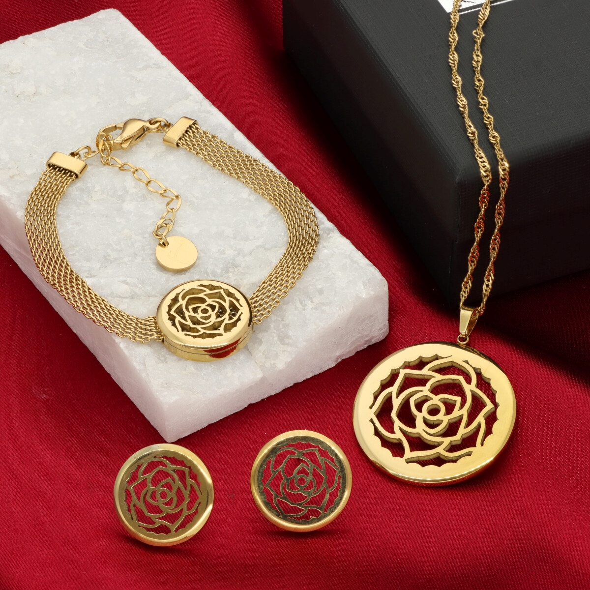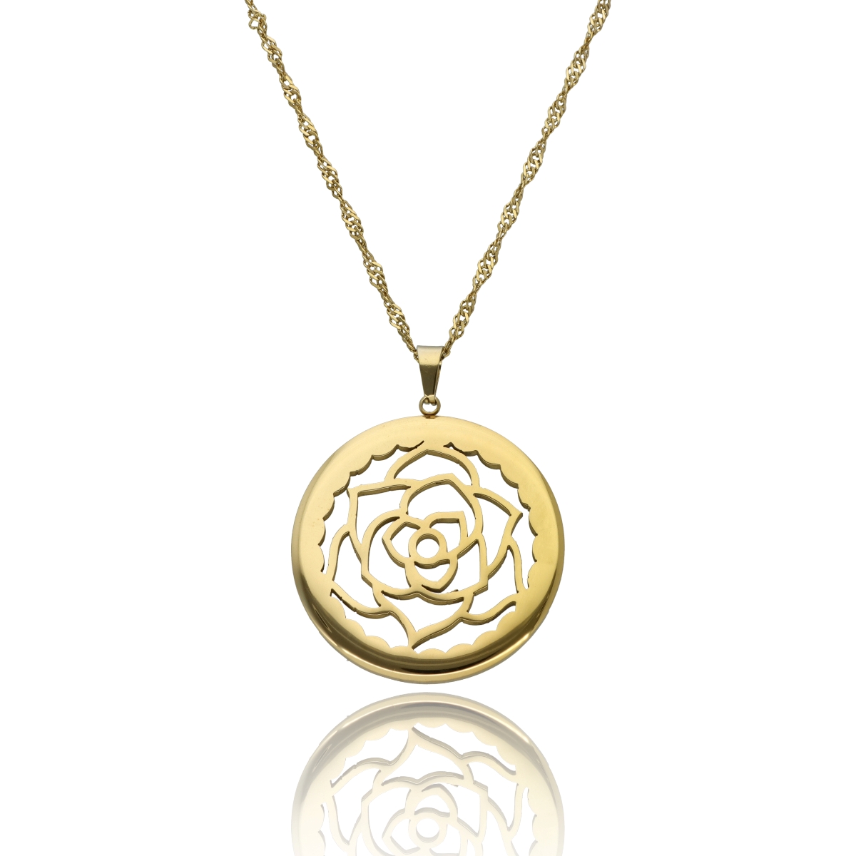 Naszyjnik typu medalion wykonany z wysokogatunkowej, hipoalergicznej stali szlachetnej 316L, pozłacanej 16-karatowym złotem. Charakteryzuje się wyjątkową odpornością na ścieranie, zmatowienie i działanie wilgoci. Zawieszka o średnicy 3 cm umieszczona jest na ozdobnym, skręcanym łańcuszku o długości 60 cm + 5 cm regulacji. Każdy naszyjnik pakowany jest w eleganckie pudełko YVON. Do kompletu dostępne są pasująca bransoletka i kolczyki z tej samej kolekcji.