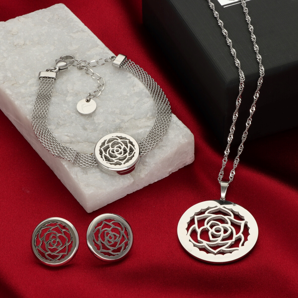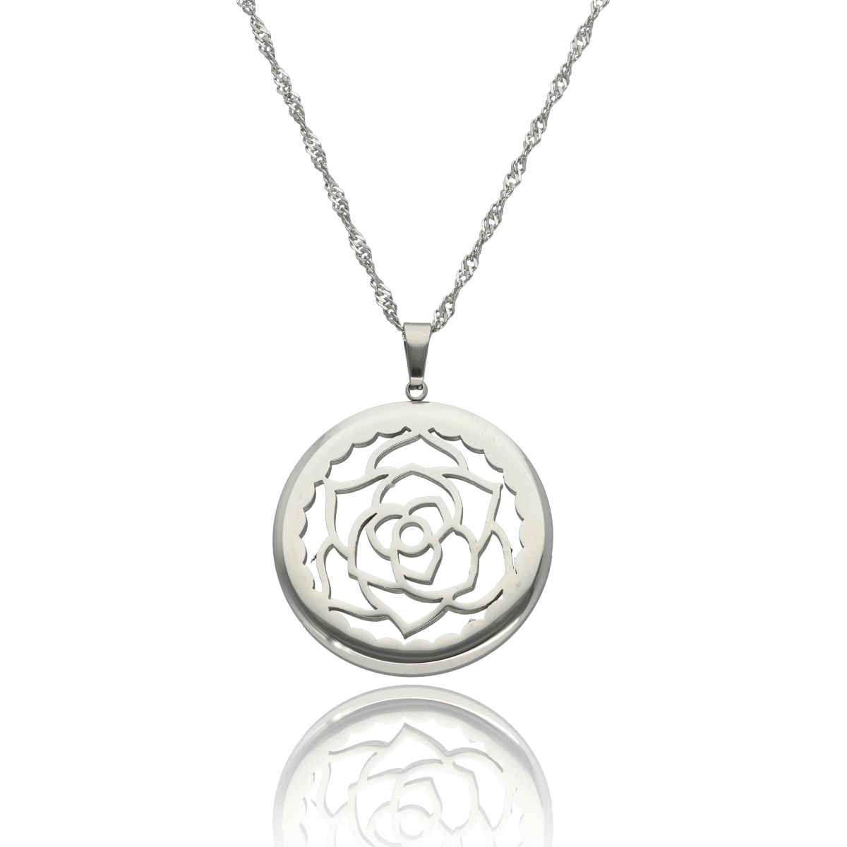 Naszyjnik wykonany z hipoalergicznej stali szlachetnej 316L o wysokim połysku i odporności na ścieranie. Zawieszka o średnicy 3 cm została umieszczona na ozdobnym łańcuszku o długości 60 cm + 5 cm regulacji. Każdy egzemplarz pakowany jest w eleganckie pudełko YVON. Do kompletu dostępne są pasująca bransoletka i kolczyki.