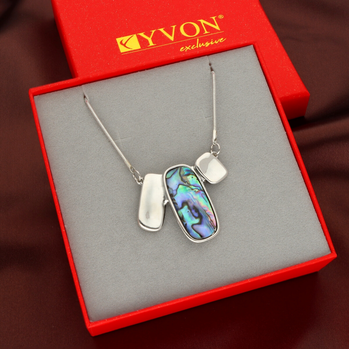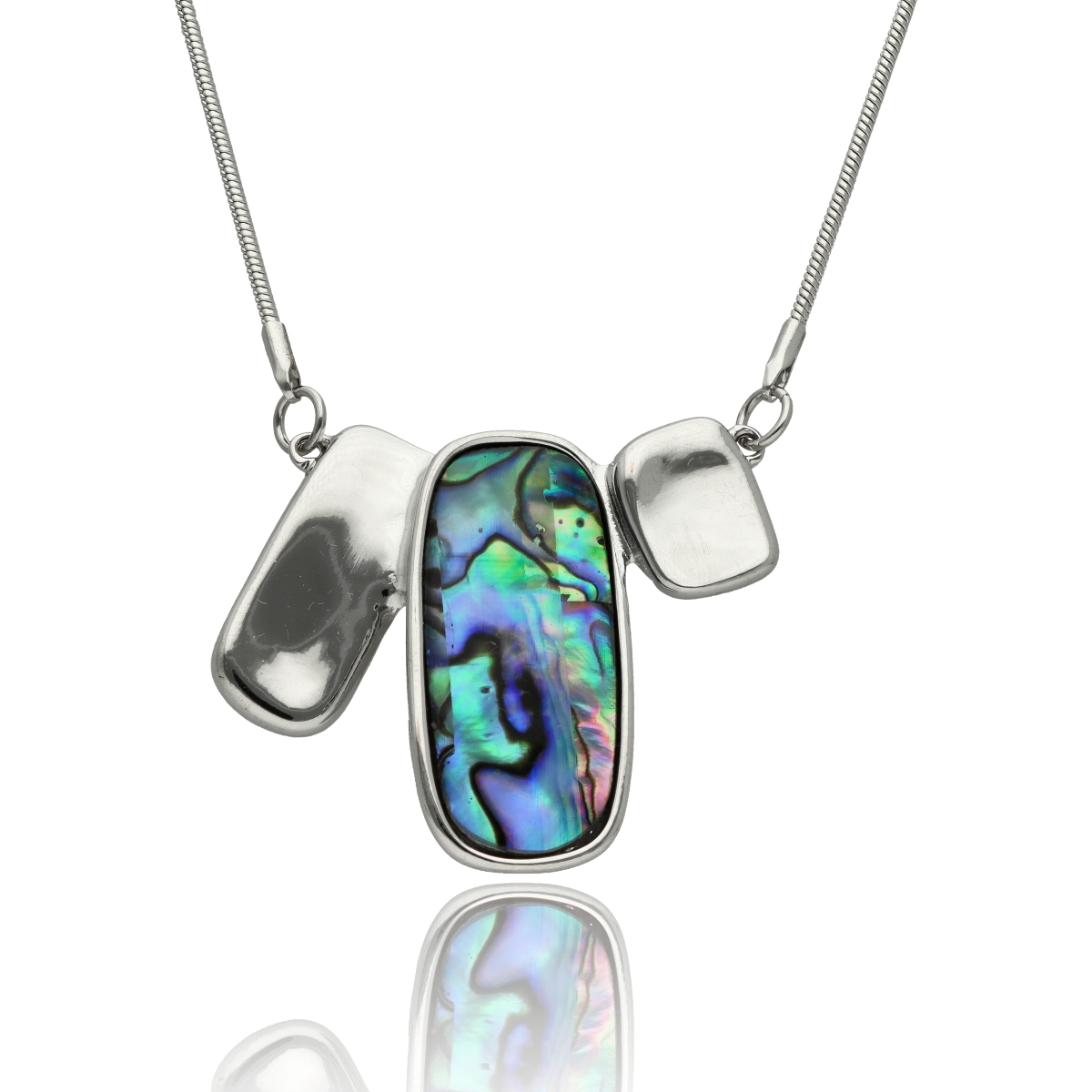 Elegancki, krótki naszyjnik wykonany z metalu antyalergicznego, ozdobiony efektowną zawieszką o długości ok. 5 cm. Zawieszka została wykonana z naturalnej muszli Abalonej, tworząc harmonijne, przyciągające uwagę połączenie.