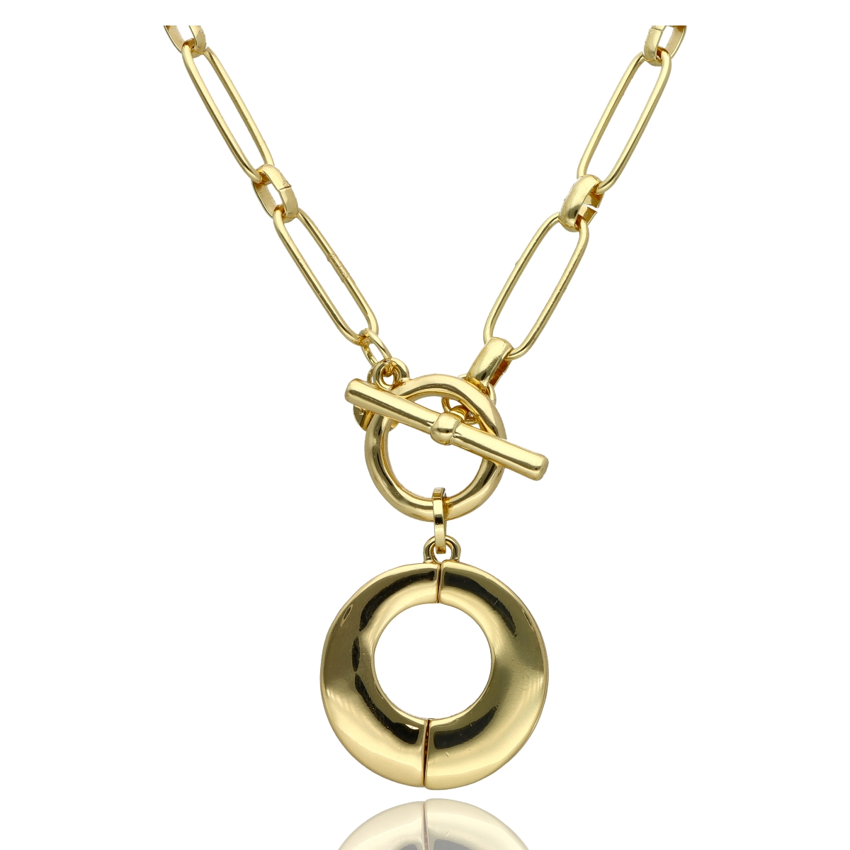 Opis produktu: Efektowny naszyjnik o nowoczesnym, wyrazistym charakterze, wykonany z wysokiej jakości hipoalergicznego metalu (zamak – stop cynku), zapewniającego komfort noszenia oraz trwałość. Model wyróżnia się eleganckim wykończeniem w modnym odcieniu light gold – jasnego, subtelnego złota inspirowanego włoskim stylem biżuterii. To właśnie ten odcień nadaje całości luksusowego, ale jednocześnie bardzo świeżego i współczesnego wyglądu. Tego typu złoto jest obecnie jednym z najmocniejszych trendów – jaśniejsze, bardziej „soft” niż klasyczne żółte złoto. Wyraziste ogniwa tworzą spójną, elegancką formę, która przyciąga uwagę i pięknie układa się na szyi. Naszyjnik doskonale sprawdzi się zarówno w codziennych stylizacjach, jak i w bardziej eleganckich zestawieniach. Długość naszyjnika: 44 cm Materiał: metal hipoalergiczny (zamak)