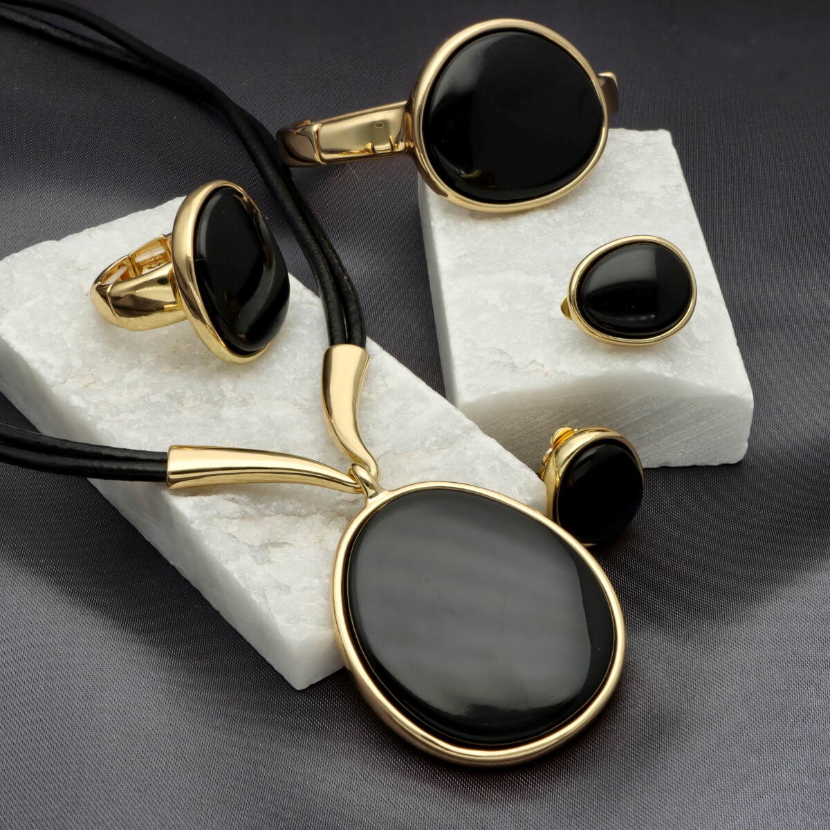 Eleganski dekoltowy naszyjnik, wykonany z żywicy i skóry naturalnej. Długość 45 cm + 8 cm regulacji. Produkt hipoalergiczny. Stylowy i elegancki – doskonale prezentuje się solo lub jako część zestawu z bransoletką, klipsami i pierścionkiem.