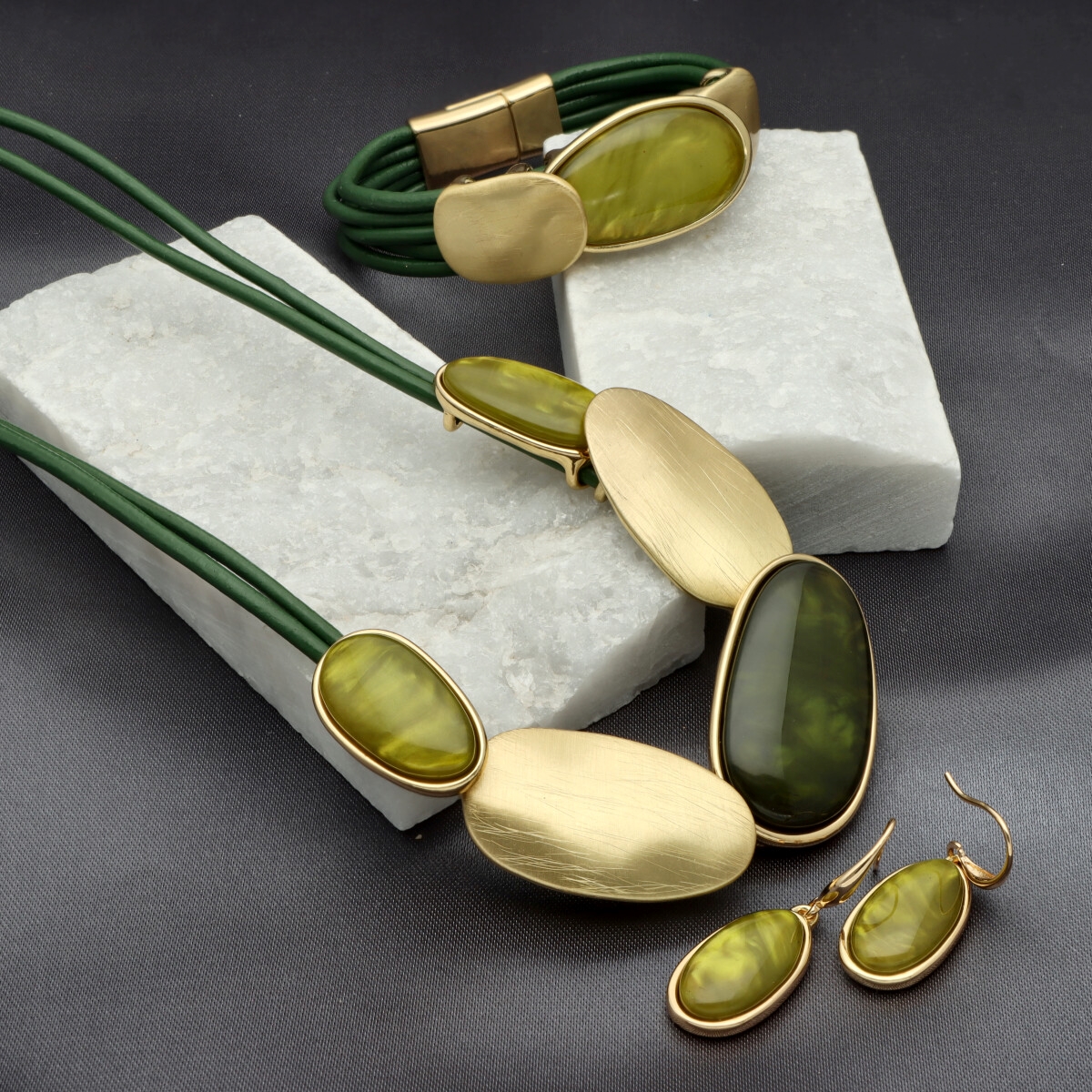 Eleganski dekoltowy naszyjnik, wykonany z żywicy i skóry naturalnej. Długość 45 cm + 8 cm regulacji. Produkt hipoalergiczny. Stylowy i elegancki – doskonale prezentuje się solo lub jako część zestawu z bransoletką i kolczykami.