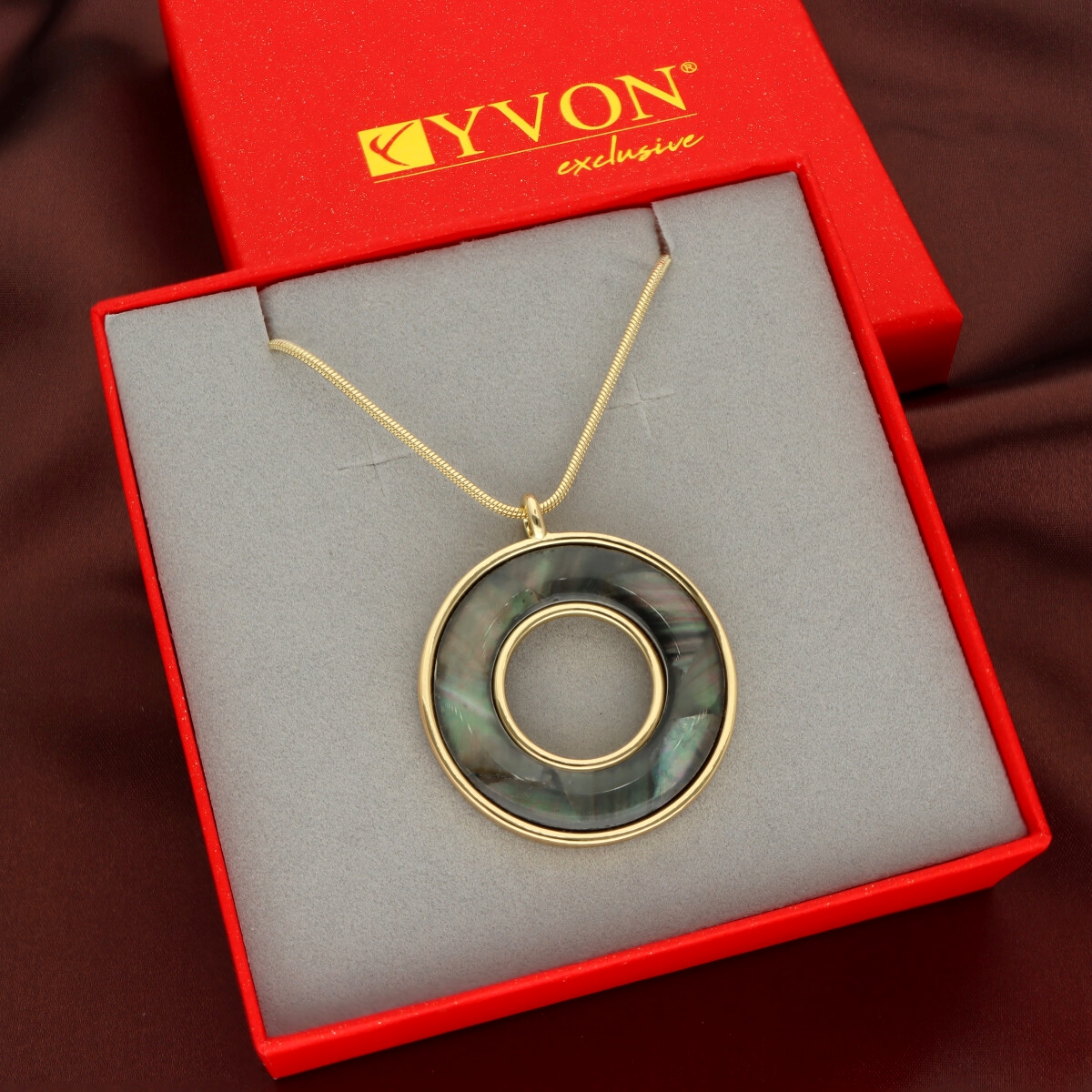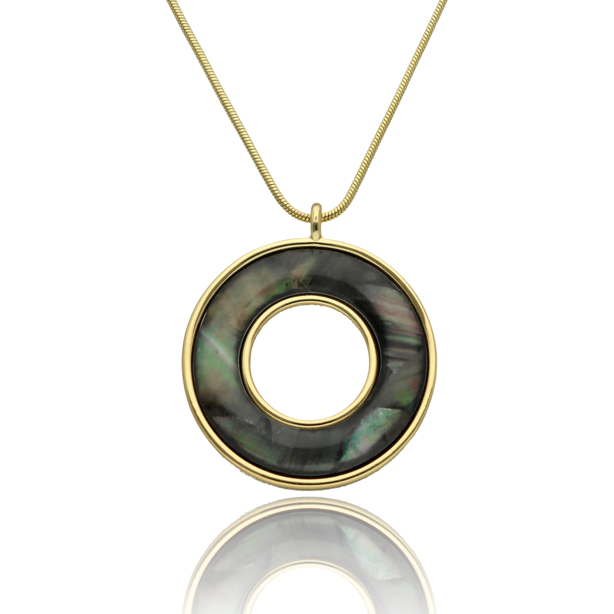 Elegancki, długi naszyjnik wykonany z metalu antyalergicznego, ozdobiony efektowną zawieszką o długości ok. cm. Zawieszka została wykonana z naturalnej muszli szarej, tworząc harmonijne, przyciągające uwagę połączenie.