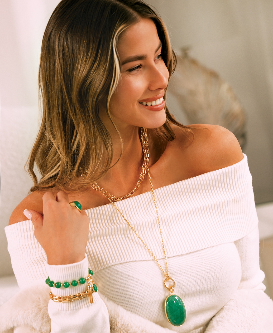 Elegancki, długi naszyjnik z naturalnym kamieniem awenturyn w owalnym kształcie. Kamień wyróżnia się świeżą, zieloną kolorystyką z delikatnym, naturalnym połyskiem, który nadaje całości wyrafinowanego i harmonijnego charakteru.