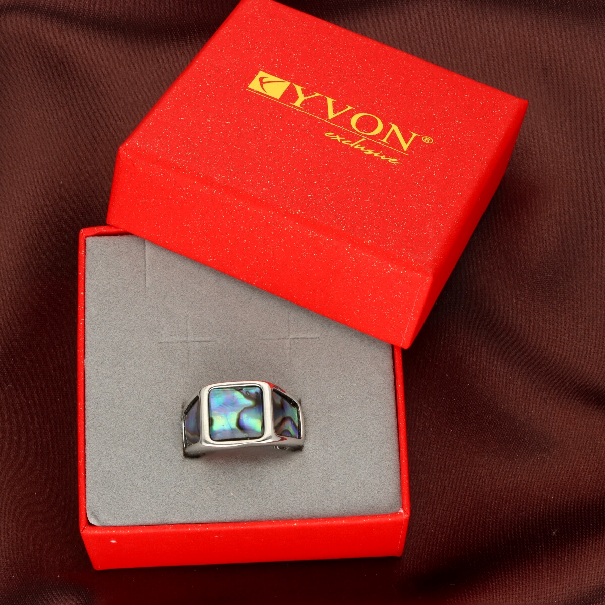 Elegancki pierścionek / damski sygnet wykonany z metalu antyalergicznego – bezpieczny nawet dla wrażliwej skóry, ozdobiony naturalną muszlą Abalone.
