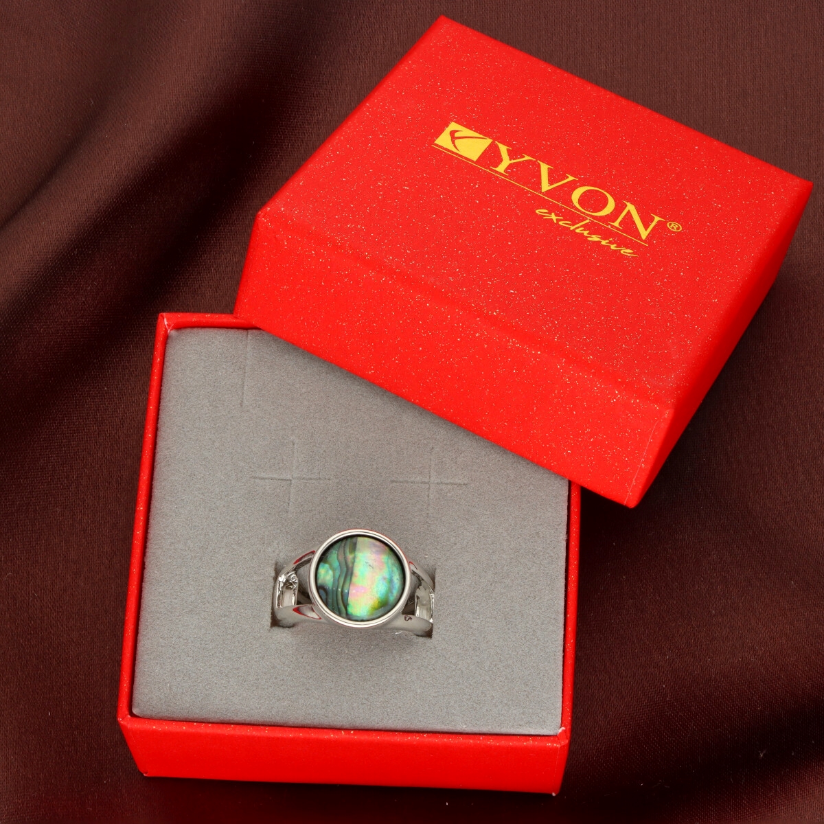 Elegancki pierścionek / damski sygnet wykonany z metalu antyalergicznego – bezpieczny nawet dla wrażliwej skóry, ozdobiony naturalną muszlą Abalone.