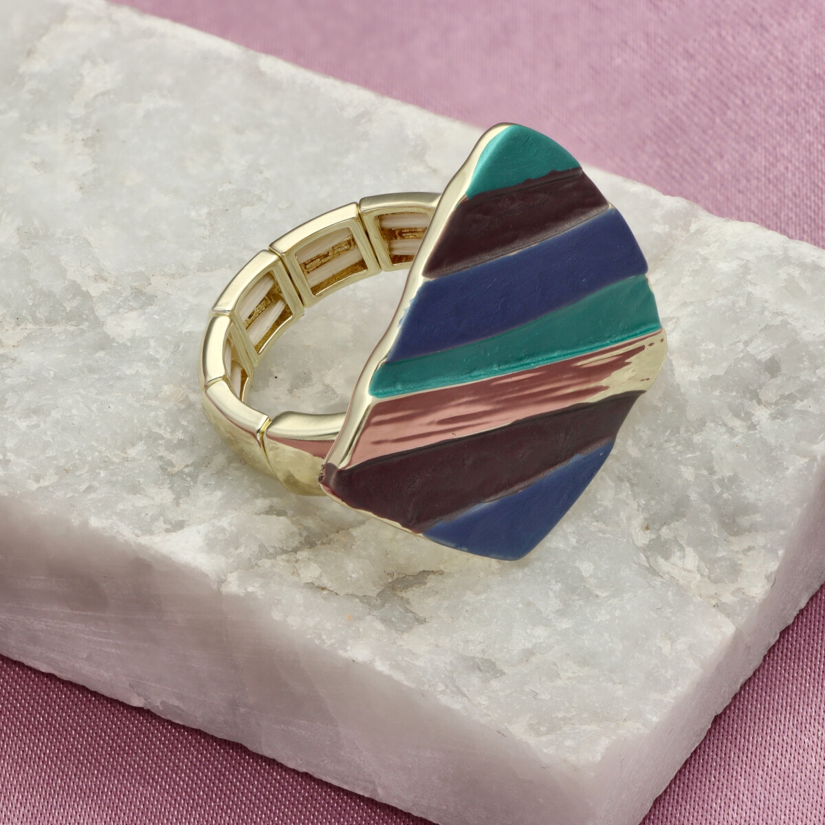 Pierścionek z ozdobnym, geometrycznym motywem o nieregularnym układzie pasów, wykonany na rozciągliwych gumkach, dzięki czemu posiada uniwersalny rozmiar i dopasowuje się do wielu wielkości palca.