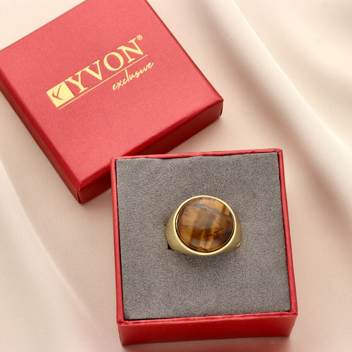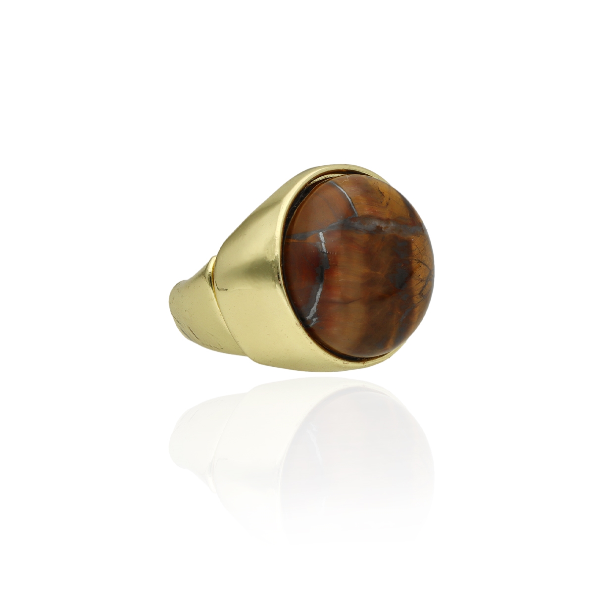 Wyrazisty pierścionek z naturalnym kamieniem tygrysie oko (Tiger Eye) w eleganckiej, masywnej oprawie. Kamień o głębokim, złoto-brązowym odcieniu z charakterystycznym połyskiem stanowi centralny punkt biżuterii.