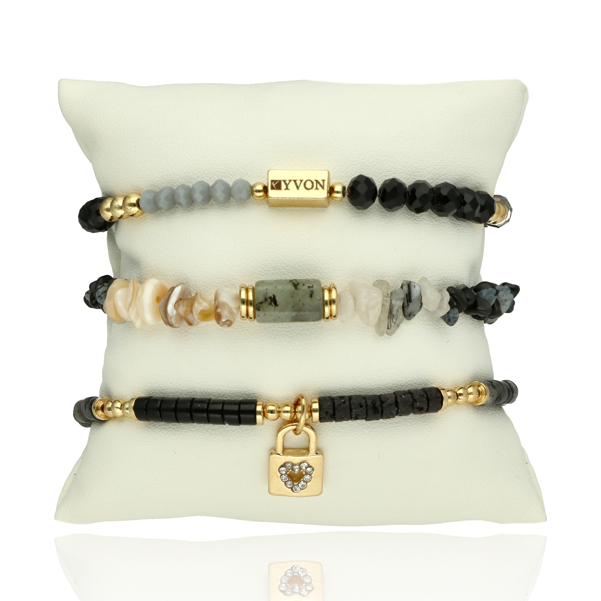 Zestaw trzech bransoletek z KAMIENIAMI NATURALNYMI (KWARC TURMALINOWY) i MUSZLĄ NATURALNĄ który łączy w sobie klasyczną elegancję i najwyższą jakość wykonania. Każdy element został starannie dobrany – od antyalergicznego mosiądzu, przez elementy z kamieni i muszli, aż po misternie fasetowane koraliki z kryształu górskiego. Subtelne połączenie tych materiałów tworzy niepowtarzalny, ponadczasowy dodatek.