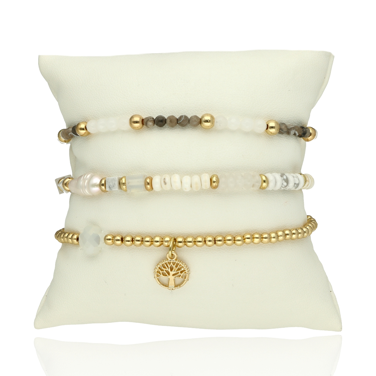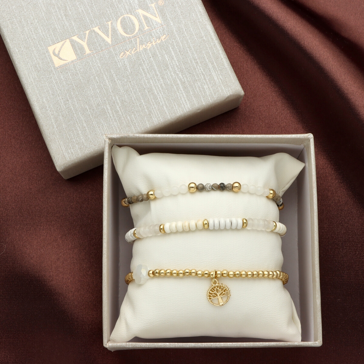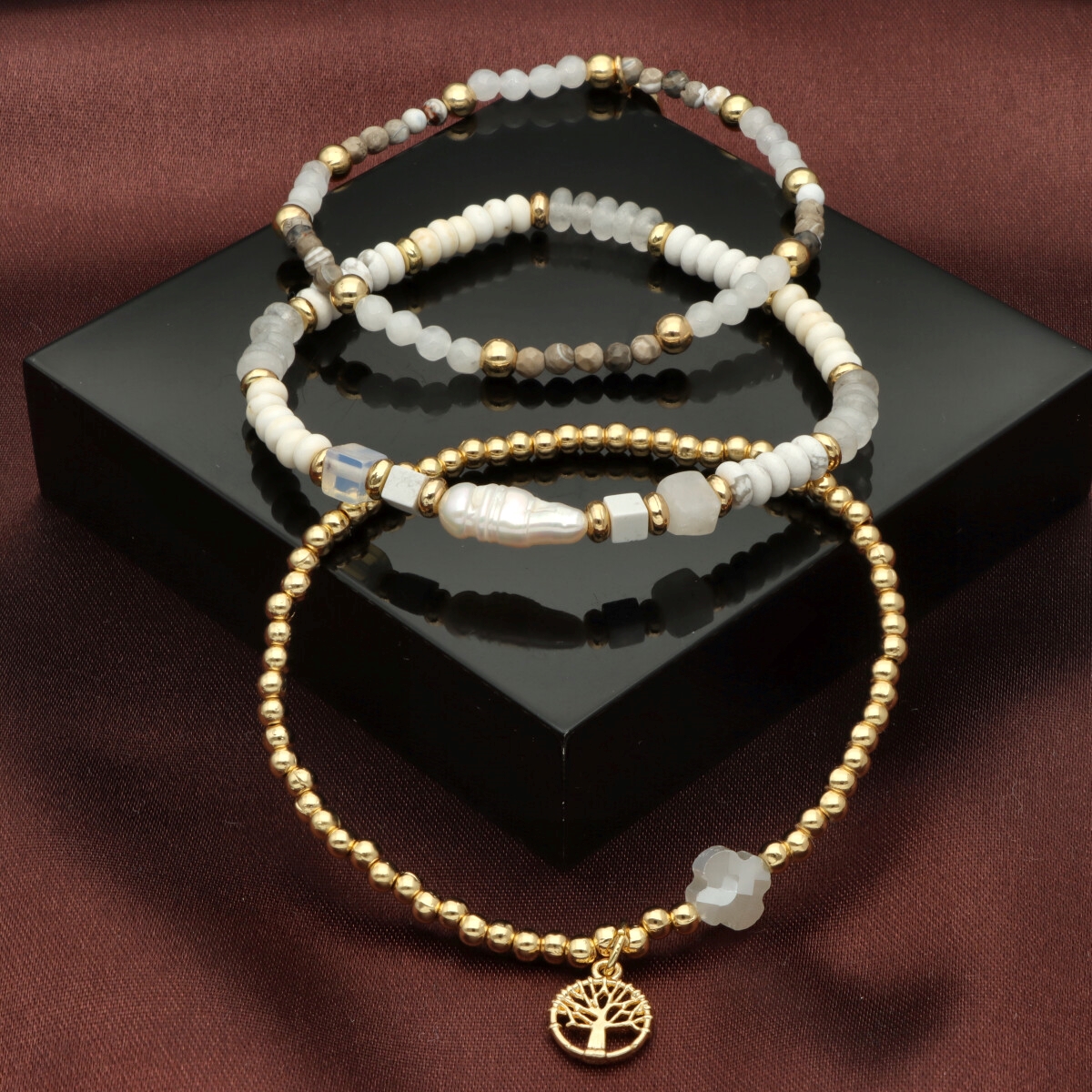 Zestaw trzech bransoletek z KAMIENIAMI NATURALNYMI (jadeit biały) i PERŁAMI NATURALNYMI, który łączy w sobie klasyczną elegancję i najwyższą jakość wykonania. Każdy element został starannie dobrany – od antyalergicznego mosiądzu, przez elementy z kamieni i pereł barokowych słodkowodnych, aż po misternie fasetowane koraliki z kryształu górskiego. Subtelne połączenie tych materiałów tworzy niepowtarzalny, ponadczasowy dodatek.