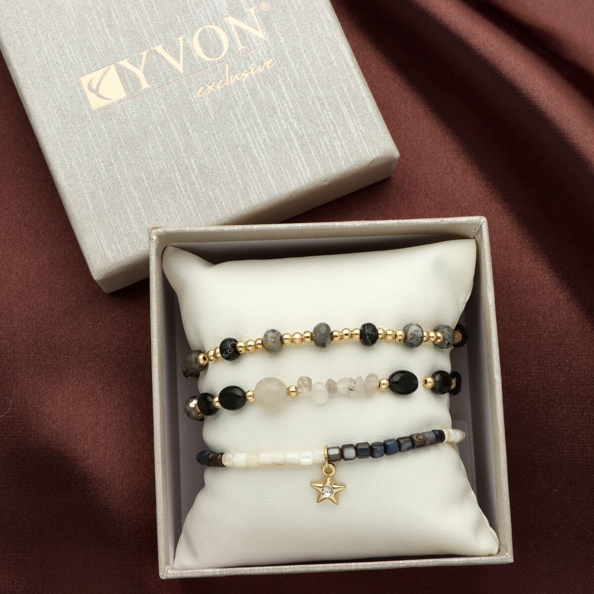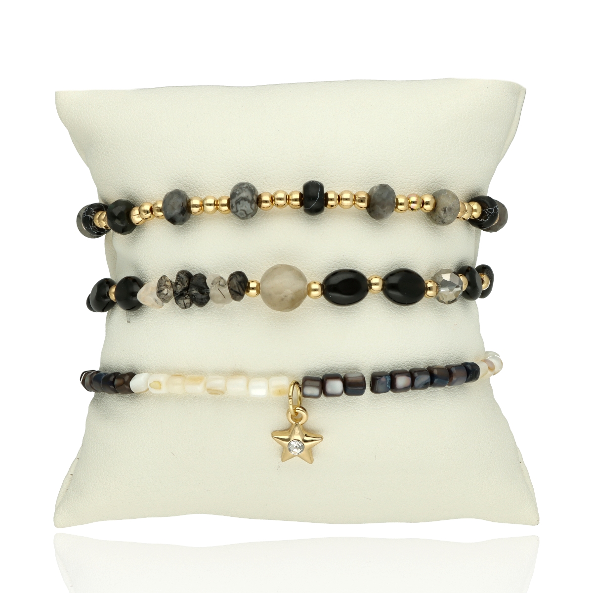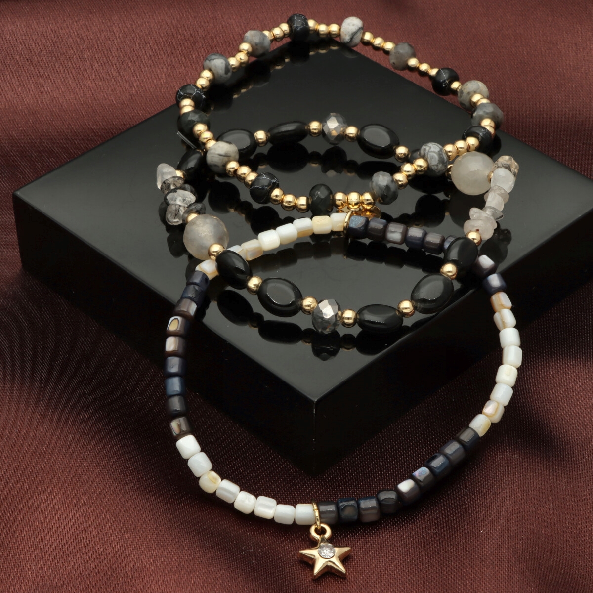 Zestaw trzech bransoletek z KAMIENIAMI NATURALNYMI (obsydian śnieżny, agat), który łączy w sobie klasyczną elegancję i najwyższą jakość wykonania. Każdy element został starannie dobrany – od antyalergicznego mosiądzu, przez elementy z kamieni, aż po misternie fasetowane koraliki z kryształu górskiego. Subtelne połączenie tych materiałów tworzy niepowtarzalny, ponadczasowy dodatek.