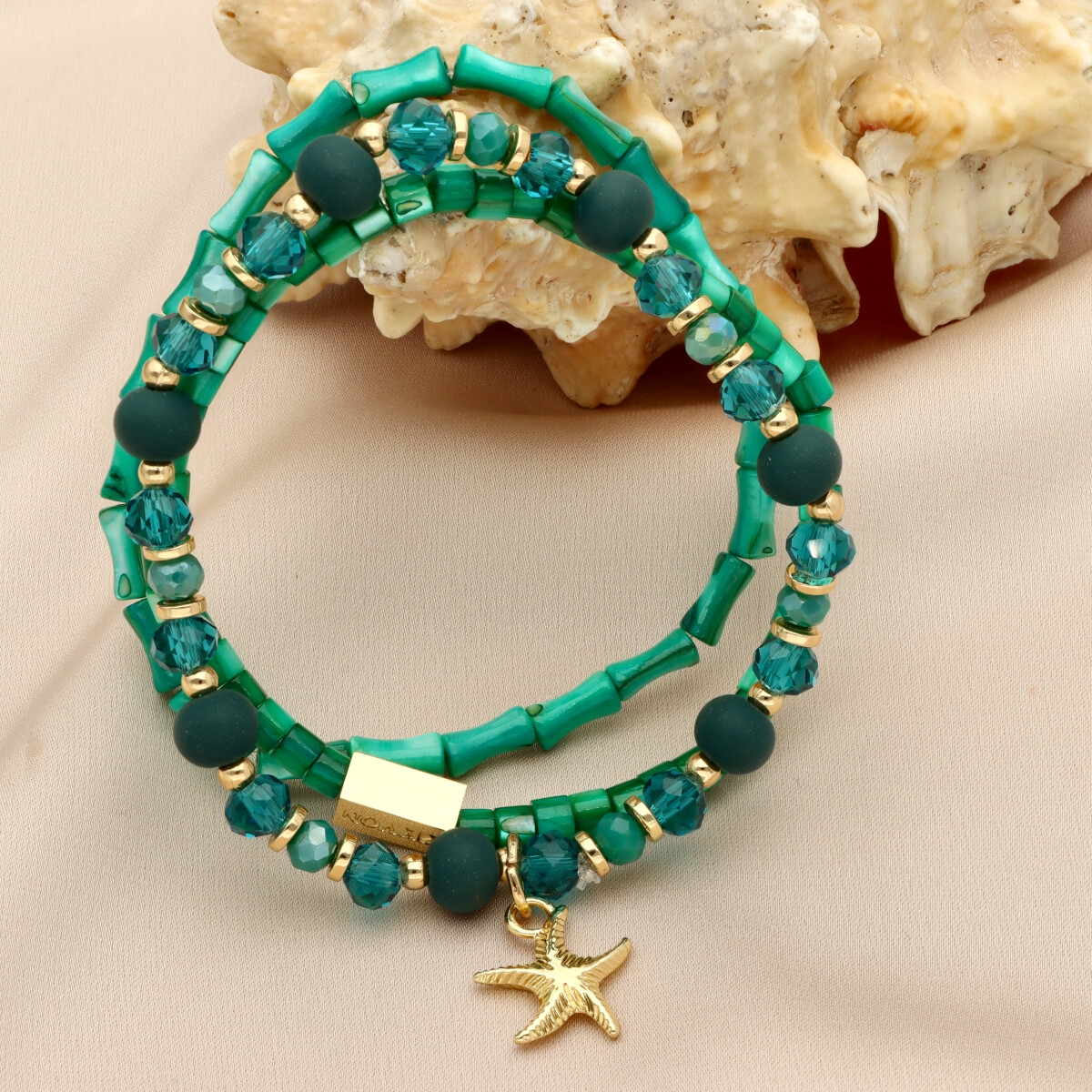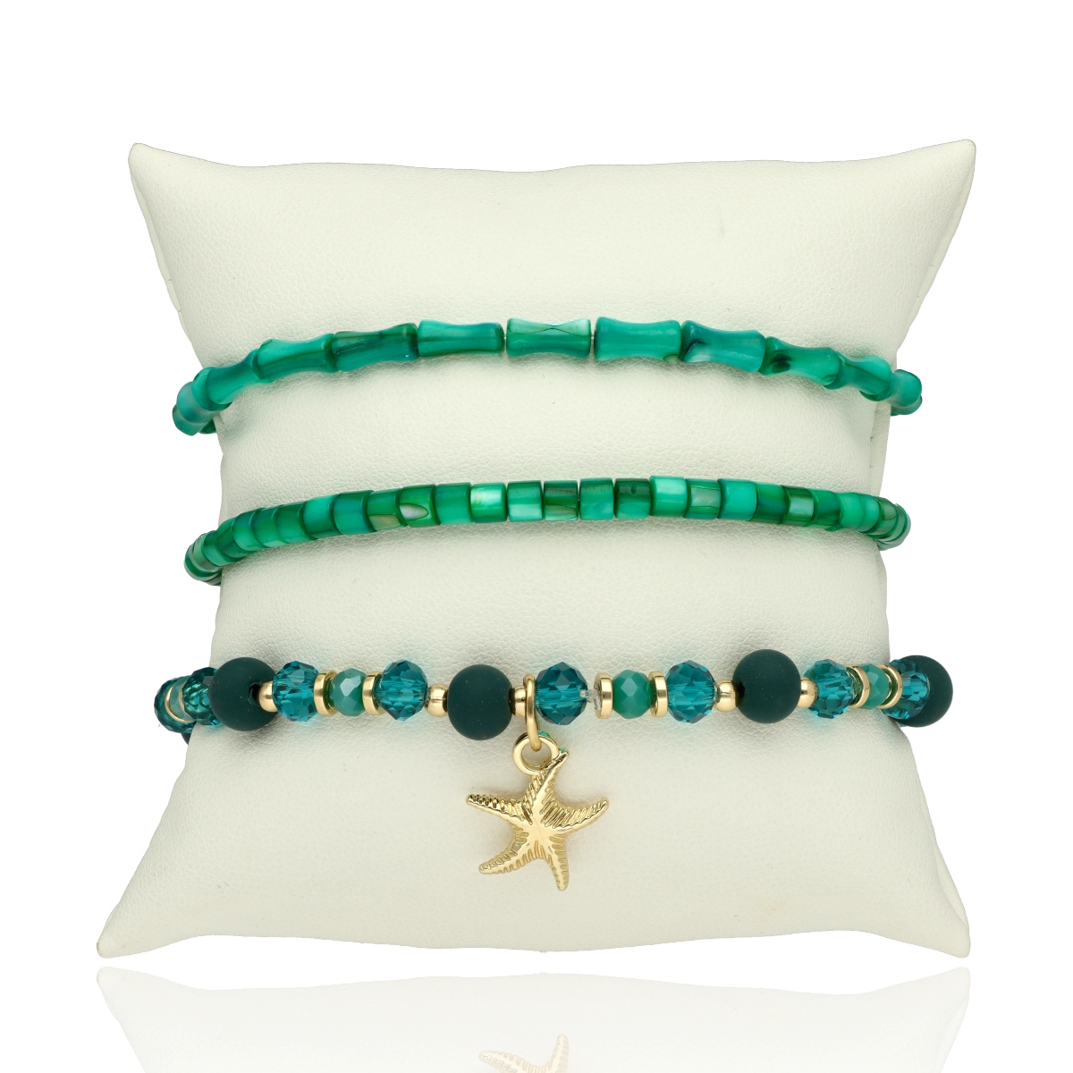 Zestaw trzech bransoletek z hipoalergicznego mosiadzu, szkła kryształowego i muszli naturalnej. Komplet, który łączy w sobie klasyczną elegancję i najwyższą jakość wykonania. Każdy element został starannie dobrany, a ich subtelne połączenie tworzy niepowtarzalny dodatek zarówno na codzień, jak i do eleganckiej kreacji. Bransoletki zapakowane są w eleganckie pudełeczko z poduszeczką, co sprawia, że zestaw doskonale nadaje się na prezent.
