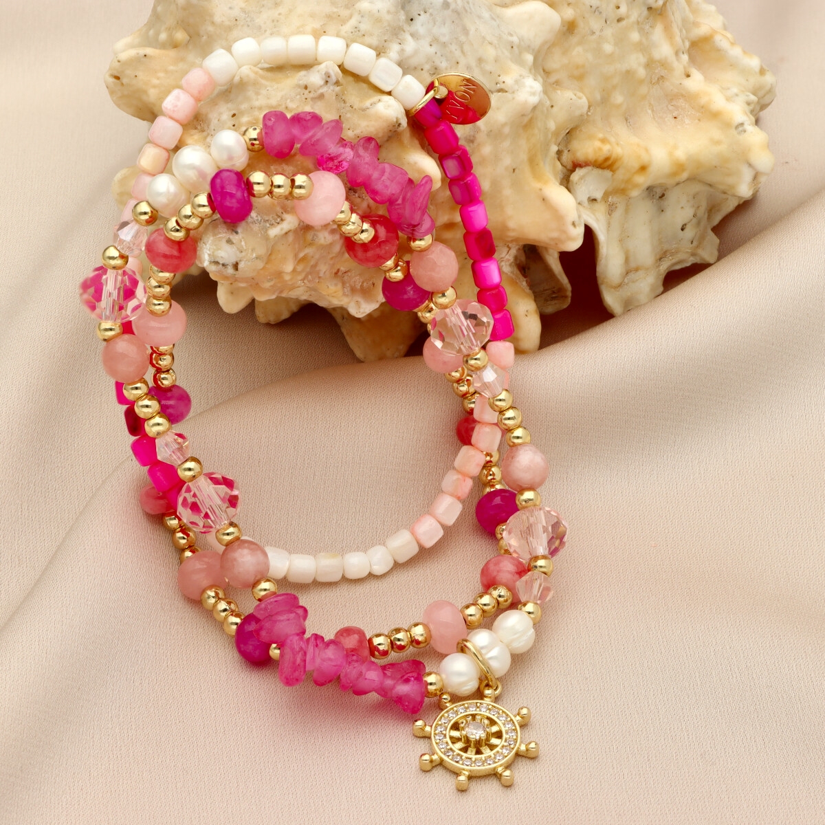 Zestaw trzech bransoletek z hipoalergicznego mosiadzu, szkła kryształowego i KAMIENI NATURALNYCH: marmur, rubelit, howlit oraz pereł i muszli naturalnych. Komplet, który łączy w sobie klasyczną elegancję i najwyższą jakość wykonania. Każdy element został starannie dobrany, a ich subtelne połączenie tworzy niepowtarzalny dodatek zarówno na codzień, jak i do eleganckiej kreacji. Bransoletki zapakowane są w eleganckie pudełeczko z poduszeczką, co sprawia, że zestaw doskonale nadaje się na prezent.