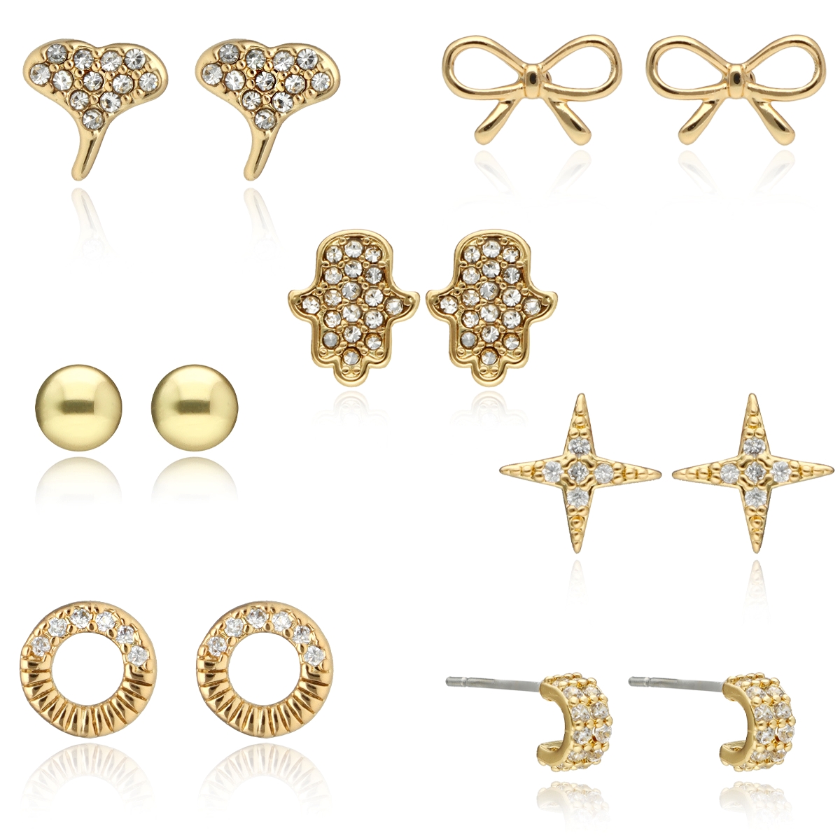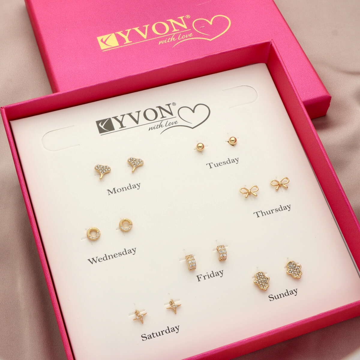 Zestaw 7 par kolczyków na każdy dzień tygodnia to kobiecy, dopracowany komplet, który pozwala dopasować biżuterię do nastroju i stylizacji. W eleganckim pudełku znajdują się subtelne wzory – od minimalistycznych kulek, przez kokardki i kółka, aż po motywy ozdobione cyrkoniami. Kolczyki zostały wykonane z mosiądzu pozłacanego i ozdobione lśniącymi cyrkoniami, które pięknie odbijają światło i nadają biżuterii delikatnego blasku. To idealny wybór zarówno do codziennych stylizacji, jak i na wyjątkowe okazje. Eleganckie opakowanie z podziałem na dni tygodnia podkreśla koncepcję „kolczyki na każdy dzień”. Materiał: mosiądz pozłacany Zdobienie: cyrkonie Zapięcie: sztyft Ilość par w zestawie: 7