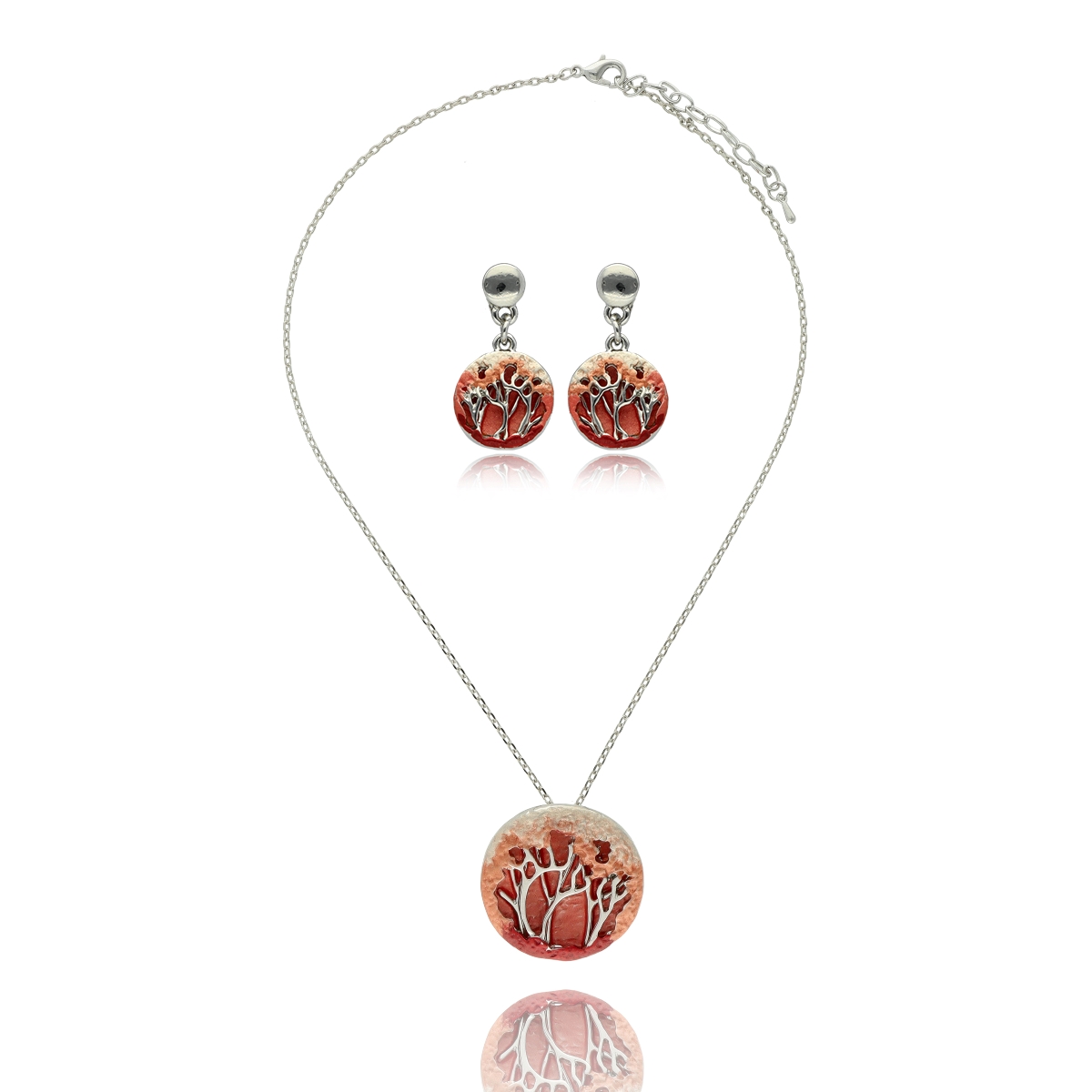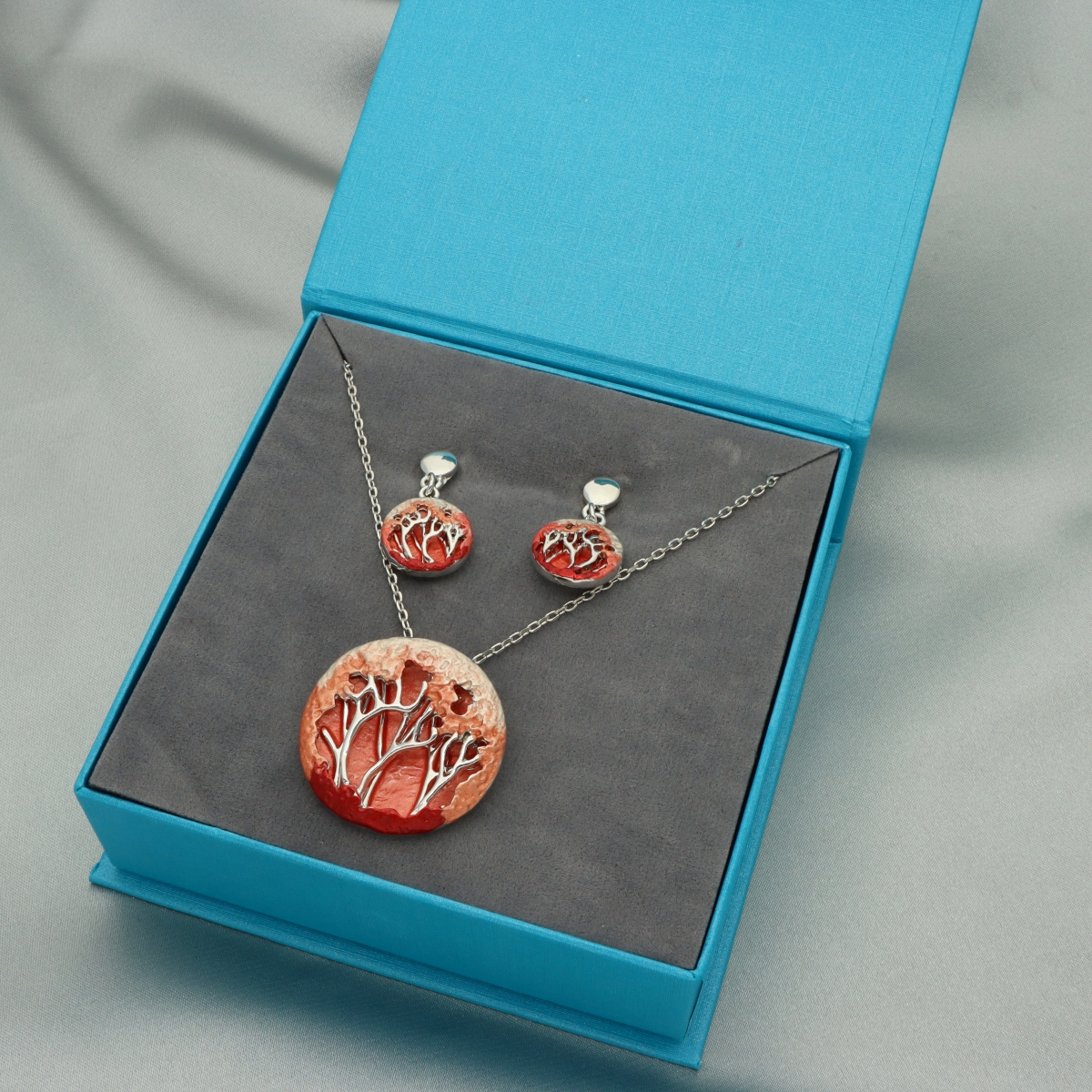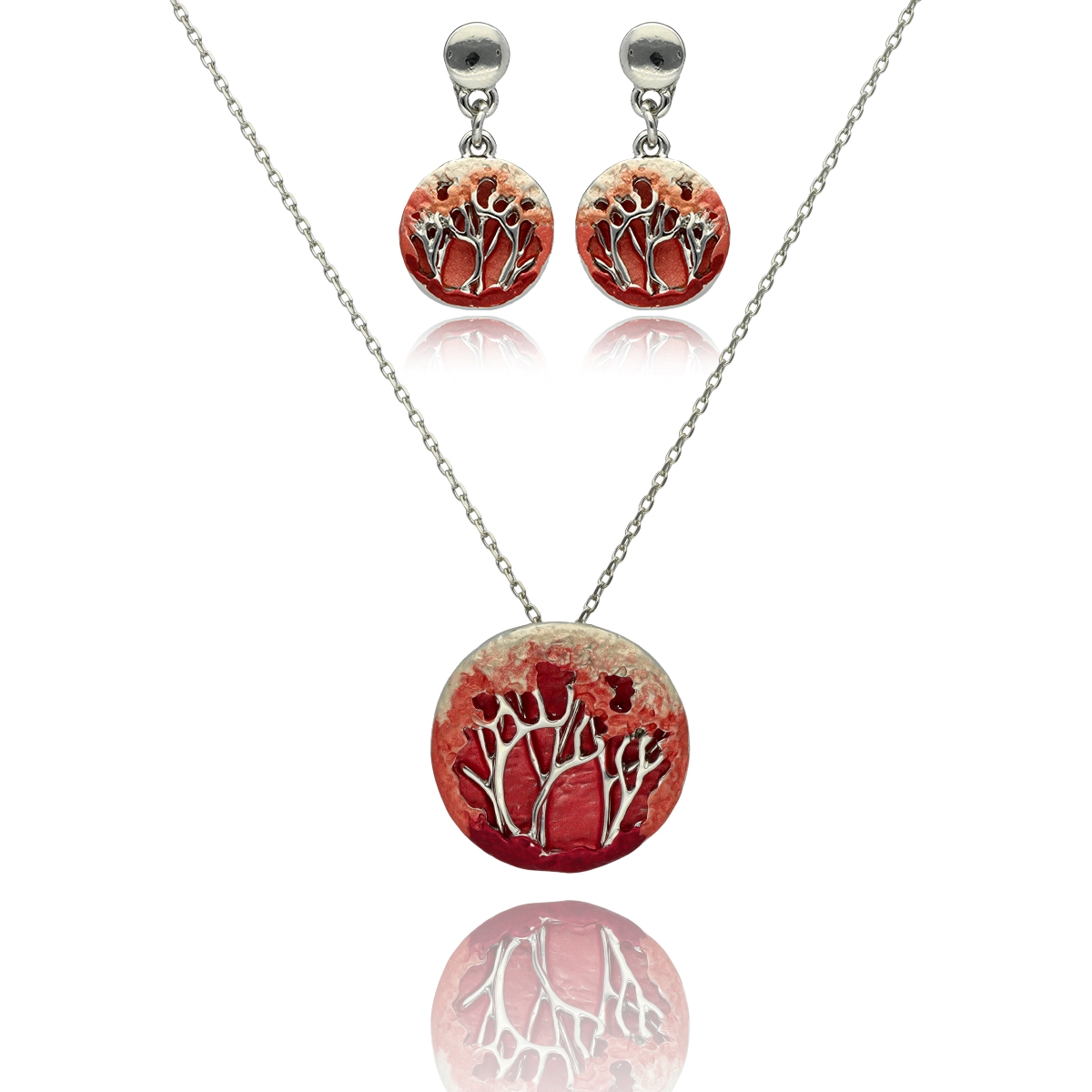 Zestaw (naszyjnik krótki i kolczyki) biżuterii artystycznej, ręcznie emaliowanej. Całość wykonana z antyalergicznego metalu. W eleganckim pudełku. Szukaj do kompletu bransoletki i broszki na magnes o tym samym indeksie numerycznym.