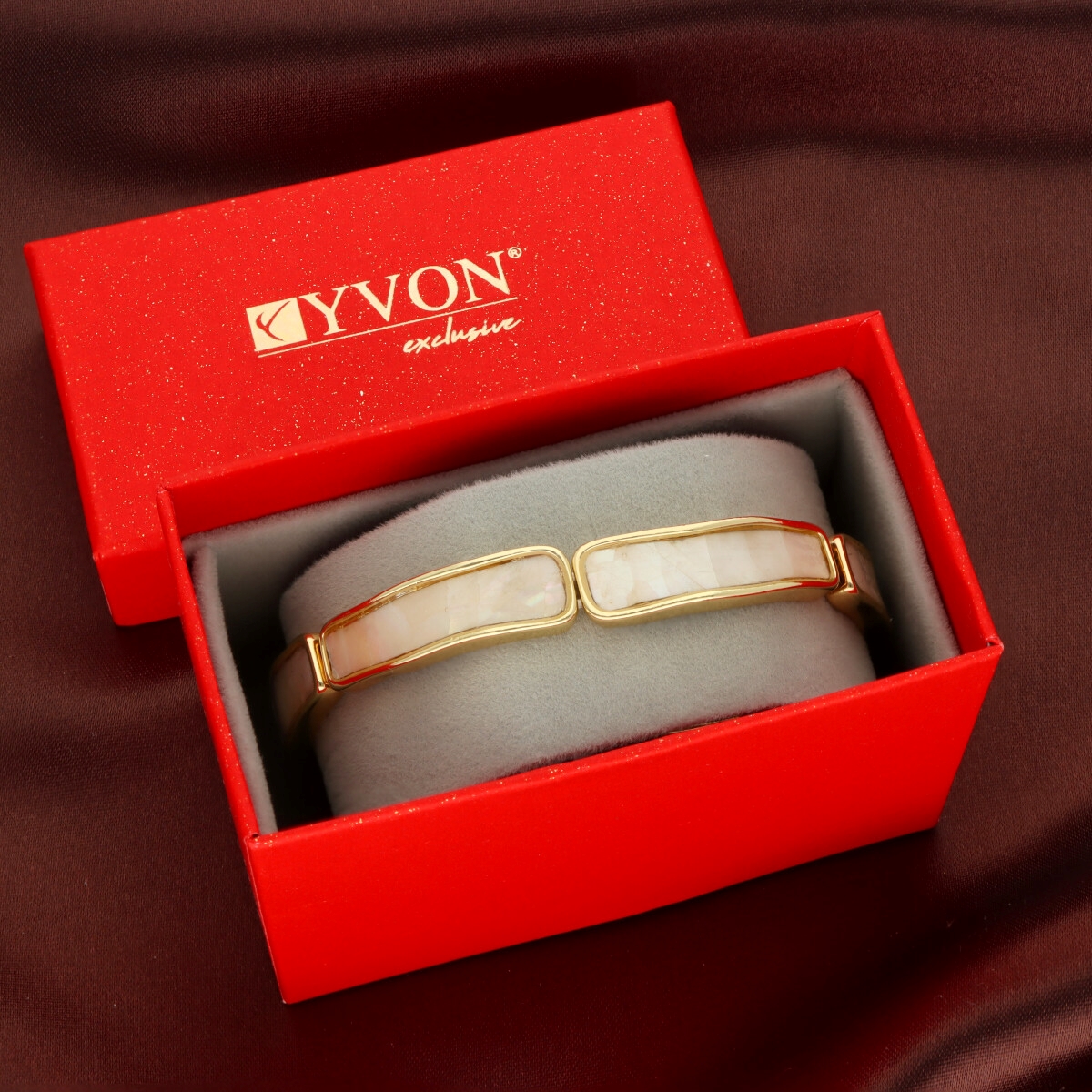 Stylowa bransoletka na elastycznej gumce, wykonana z metalowych, antyalergicznych elementów i muszli naturalnej mlecznej.