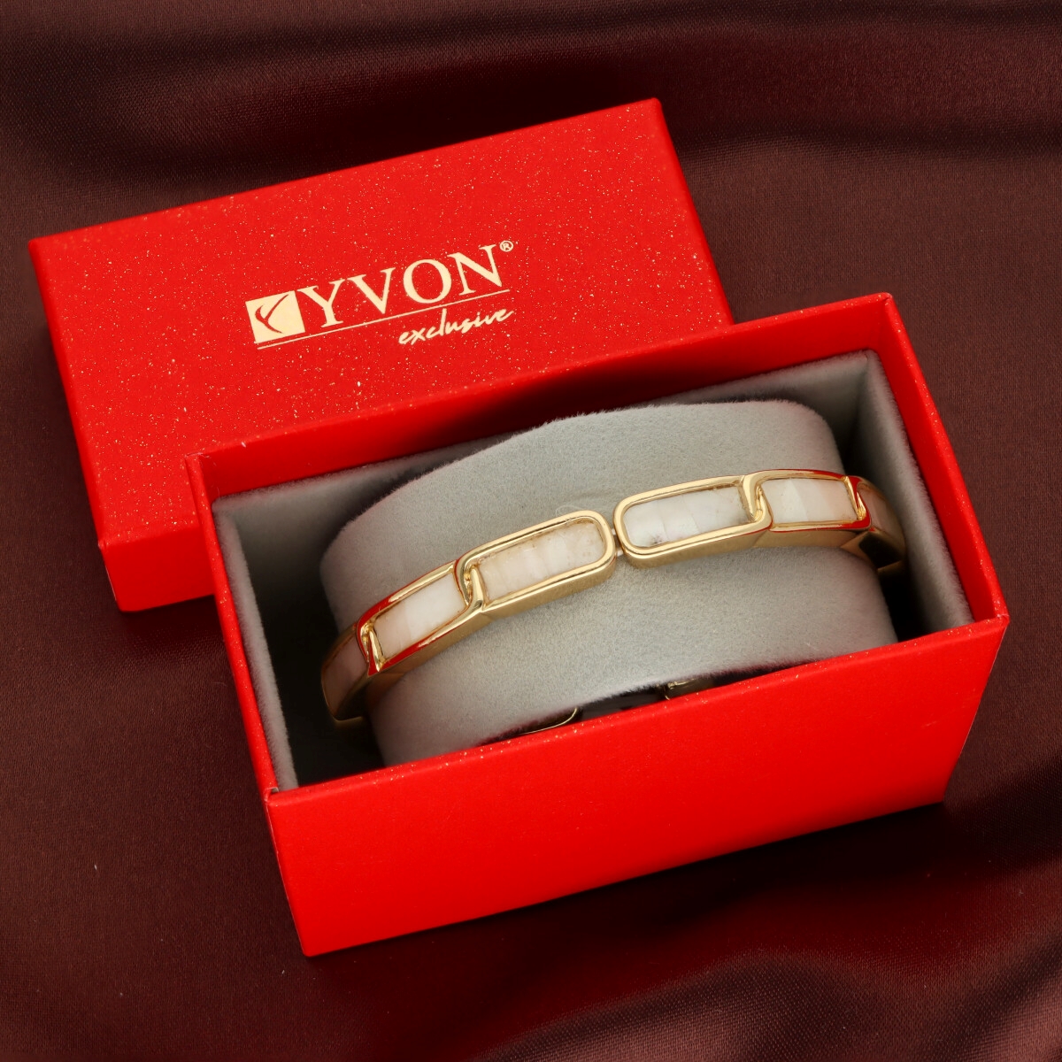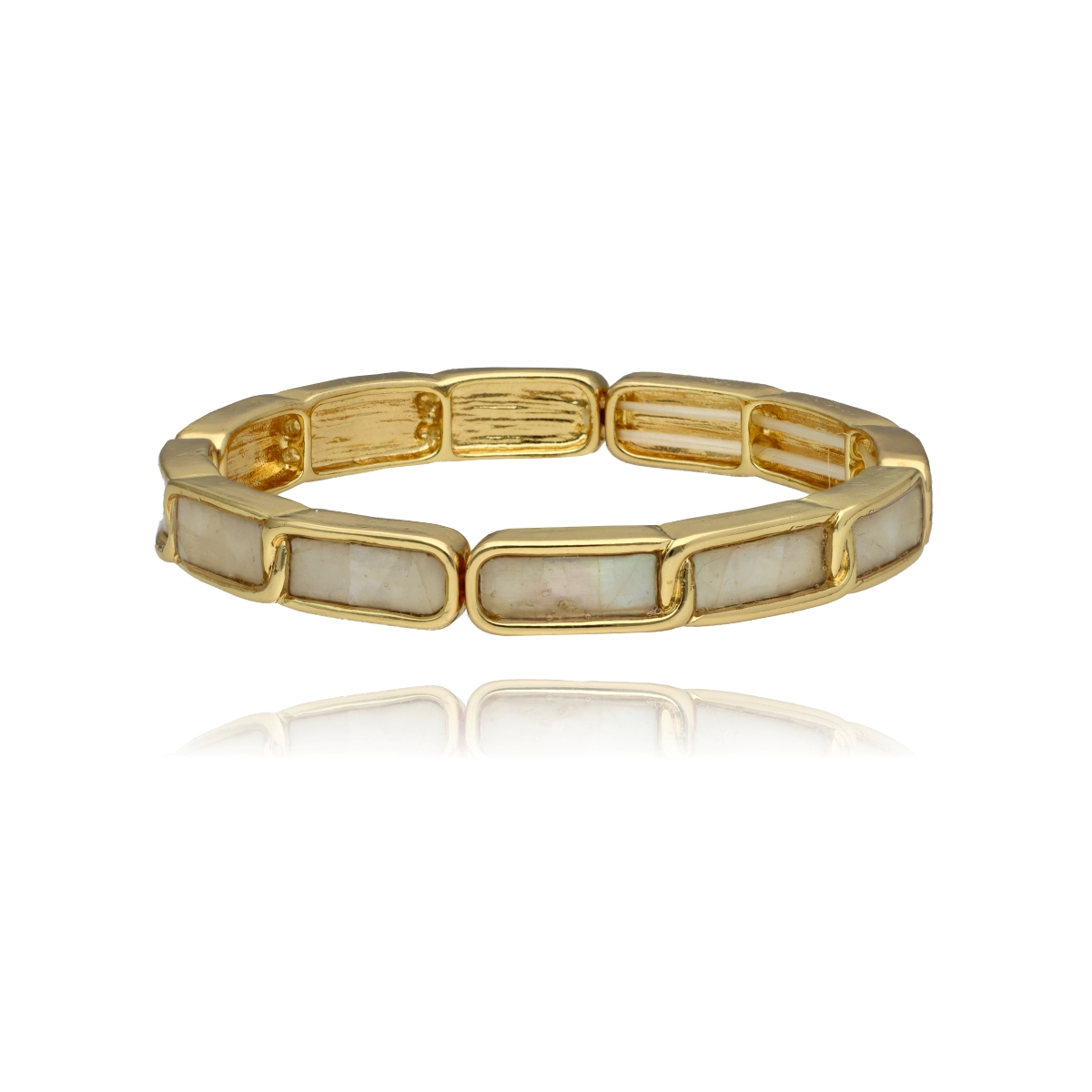 Bransoletka z muszli naturalnej mlecznej. Stylowa bransoletka na elastycznej gumce, wykonana z metalowych, antyalergicznych elementów i muszli naturalnej mlecznej. Bransoletka dopasowuje się do nadgarstka, zapewniając komfort noszenia. Doskonale komponuje się z naszyjnikiem i kolczykami z tej samej serii – idealna zarówno na co dzień, jak i na specjalne okazje. Produkt zapakowany jest w efektowne czerwone pudełko. Do kompletu proponujemy Naszyjnik (N), kolczyki (E) oraz pierścionek (R) o tym samym indeksie numerycznym.