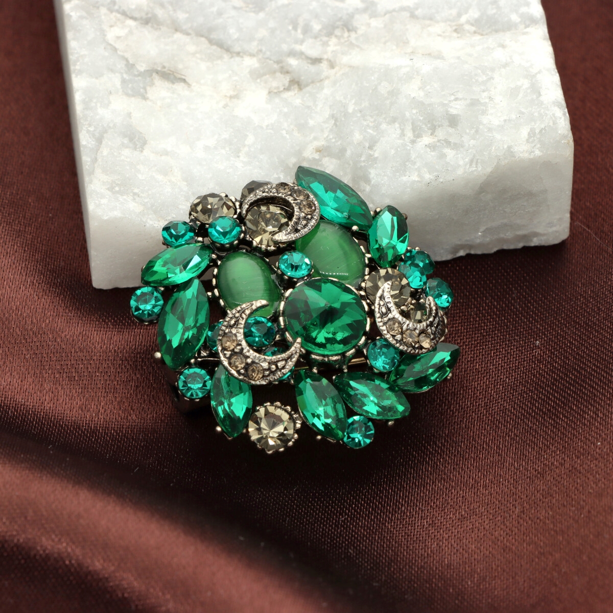 Elegancka broszka wykonana z wysokiej jakości szkła fasetowanego oraz metalu hypoalergicznego. Subtelny dodatek, który idealnie wpisuje się w jesienne stylizacje.