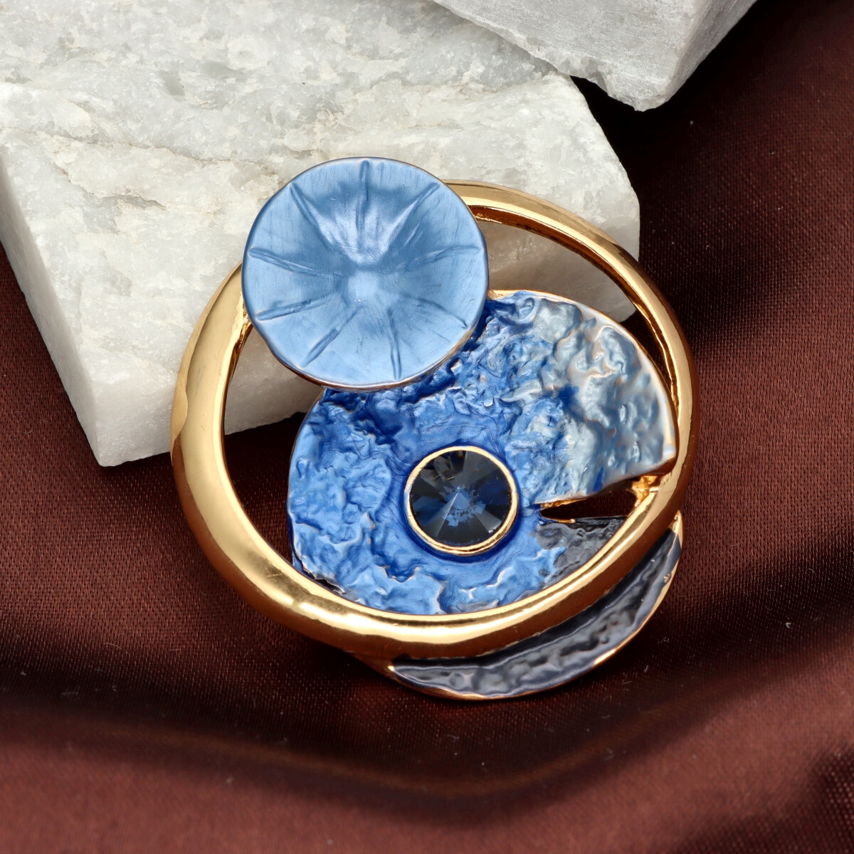 Broszka na magnes z kolekcji YVON biżuteria artystyczna, wykonana z metalu hipoalergicznego i zdobiona ręcznie nanoszoną emalią. Średnica broszki ok. 5 cm. Mocny magnes umożliwia przypięcie bez ryzyka uszkodzenia tkaniny – idealna do płaszczy, szali i torebek. Każdy egzemplarz pakowany jest w eleganckie pudełko prezentowe YVON.