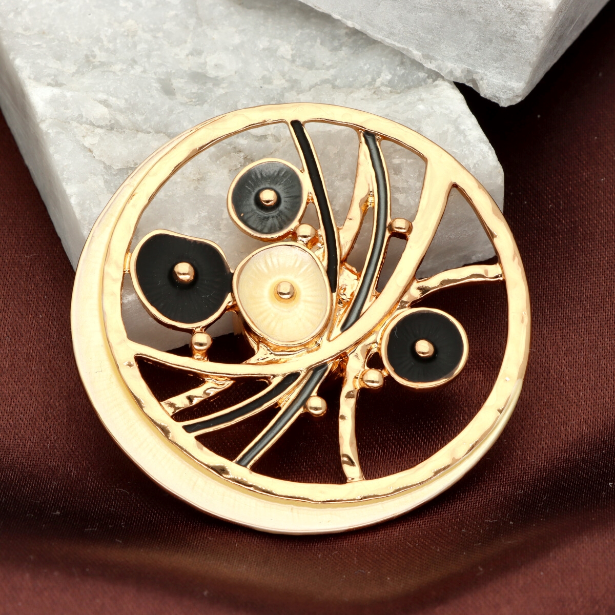 Broszka na magnes z kolekcji YVON biżuteria artystyczna, wykonana z metalu hipoalergicznego i zdobiona ręcznie nanoszoną emalią. Średnica broszki ok. 5 cm. Mocny magnes umożliwia przypięcie bez ryzyka uszkodzenia tkaniny – idealna do płaszczy, szali i torebek. Każdy egzemplarz pakowany jest w eleganckie pudełko prezentowe YVON.