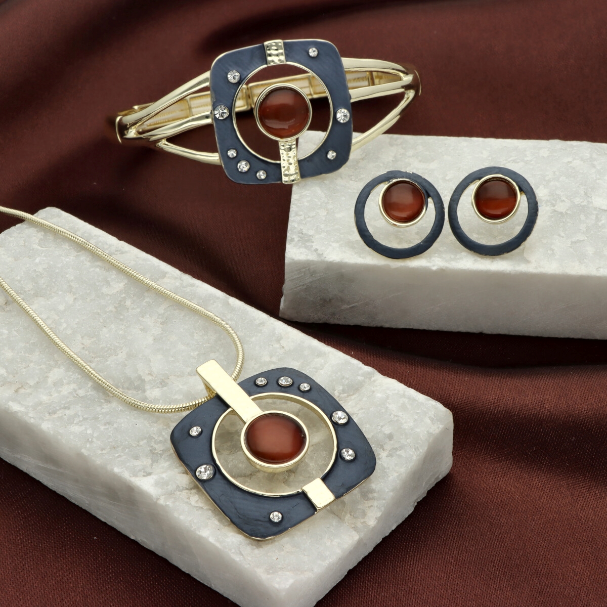 Eleganckie kolczyki wykonane z metalu antyalergicznego, kwarcu i emalii. Długosć ok. 2 cm. Szukaj do kompletu bransoletki i naszyjnika o tym samym indeksie numerycznym.