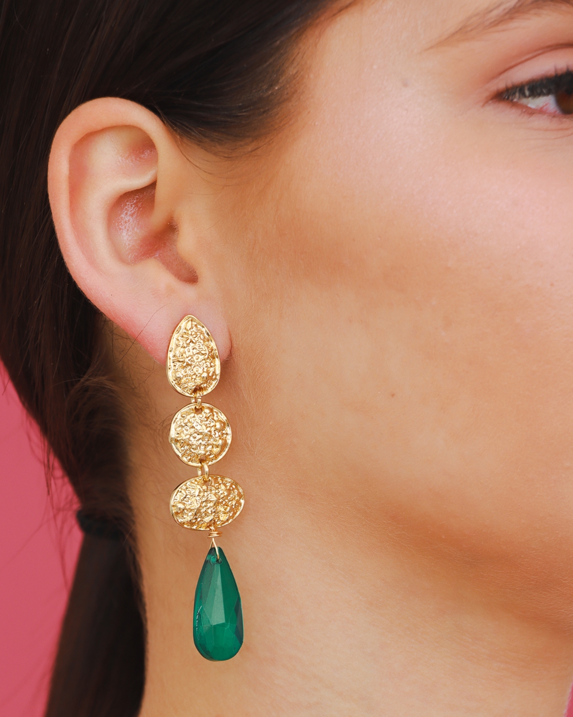 Kolczyki Sol d'Oro to połączenie subtelnej klasyki z blaskiem fasetowanego szkła. Wykonane z inkrustowanego hipoalergicznego metalu i szkła szlifowanego. Długość ok. 7 cm. Całość sprawia, że pięknie eksponują się na uchu, dodając elegancji zarówno wieczorowym, jak i codziennym stylizacjom.