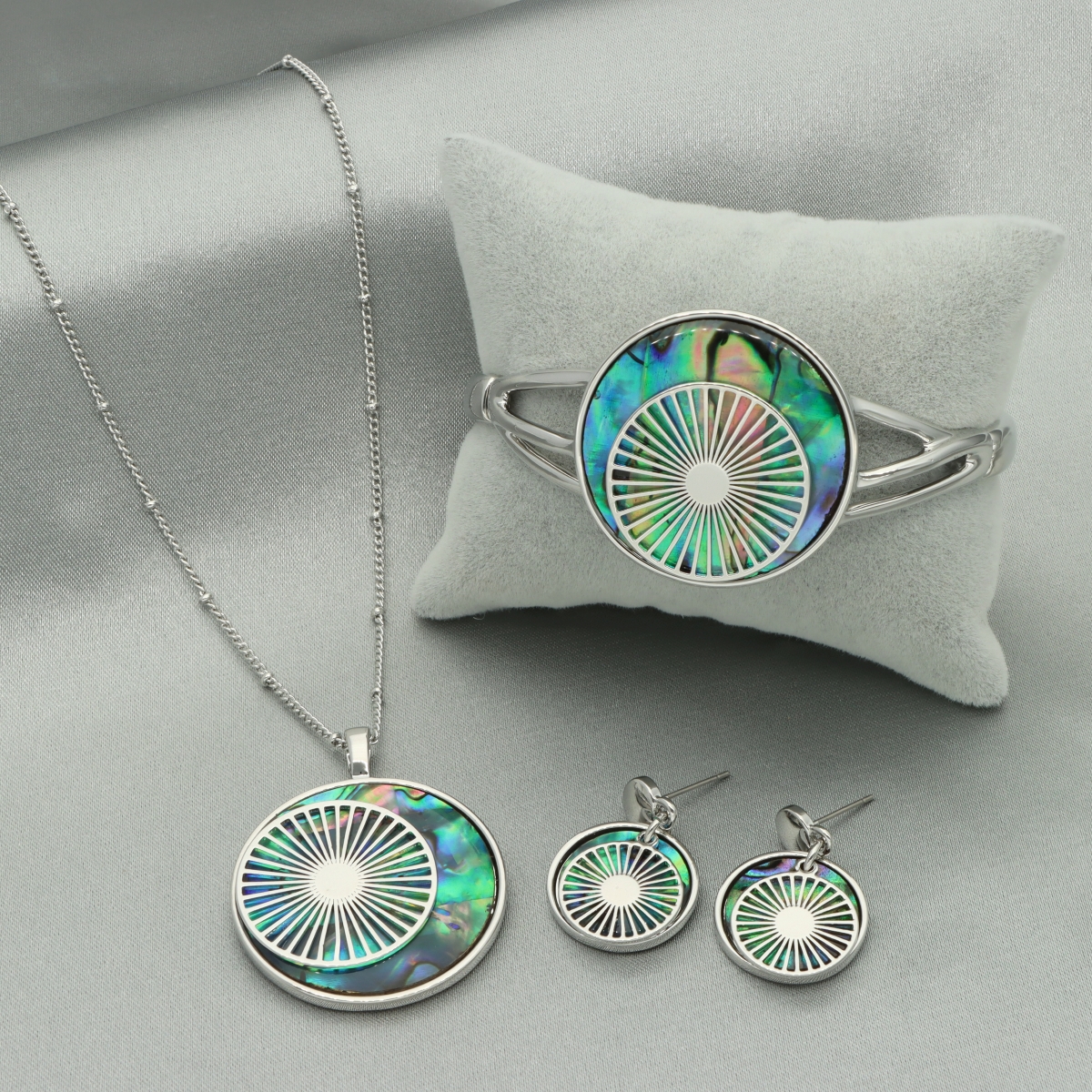 Eleganckie kolczyki wykonane z metalu antyalergicznego i muszli naturalnej Abalone. Długosć ok. 3 cm. Szukaj do kompletu bransoletki i naszyjnika o tym samym indeksie numerycznym.