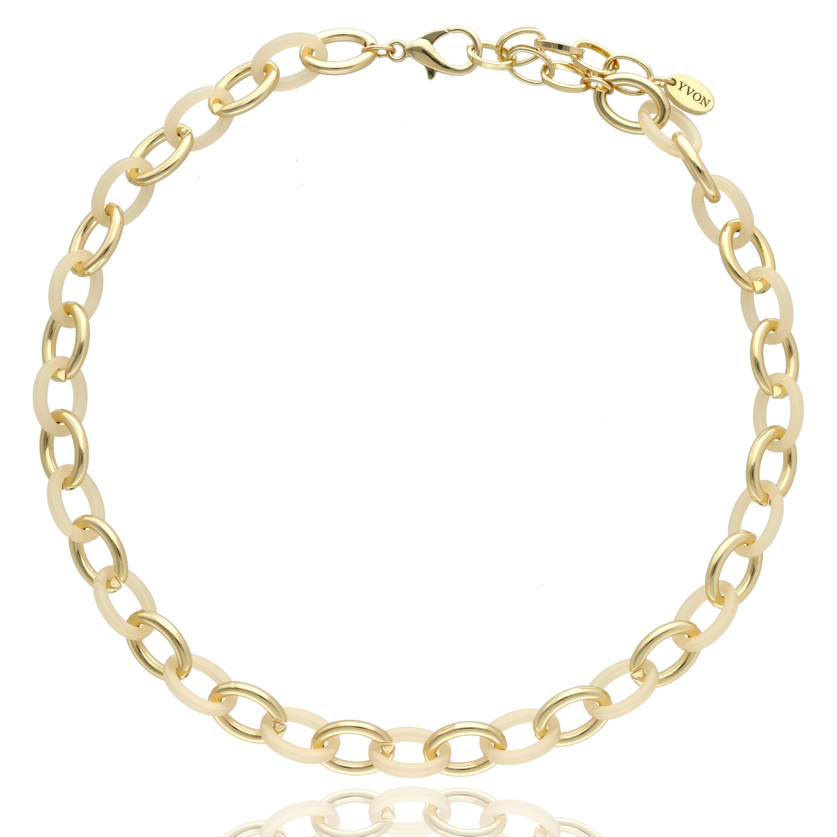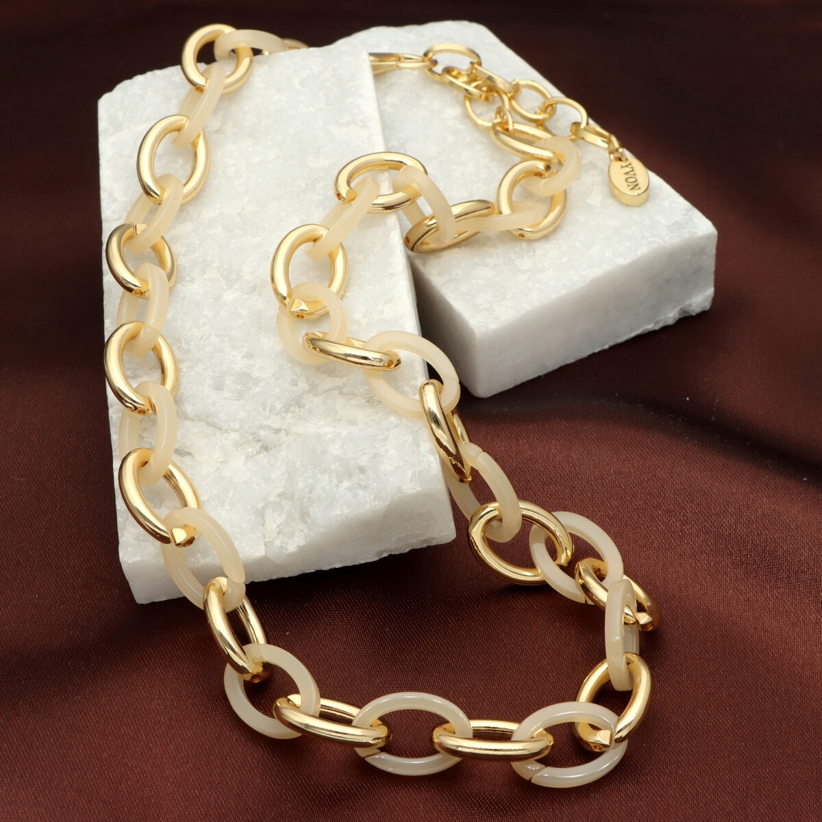 Naszyjnik wykonany z wysokiej jakości zamaku (hypoalergiczny stop cynku) oraz barwionej żywicy w ciepłych odcieniach kolorów ziemi. Ogniwa tworzą nowoczesną, a jednocześnie elegancką kompozycję, która podkreśla charakter każdej stylizacji. Długość naszyjnika wynosi 42 cm z możliwością regulacji, co pozwala na idealne dopasowanie do dekoltu. To propozycja dla kobiet ceniących biżuterię stylową i pełną wyrazu. Do kompletu dostępna jest także bransoletka w tym samym wzorze – razem tworzą wyjątkowy zestaw.