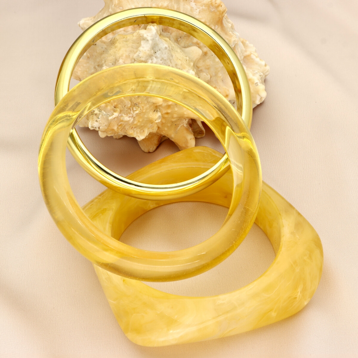 Zestawy bransolet YVON to wyraz nowoczesnej elegancji w wyjątkowo dopracowanej formie. Połączenie gładkiego, złotego metalu z dekoracyjną żywicą o subtelnym, marmurkowym efekcie tworzy kompozycję, która przyciąga uwagę, a jednocześnie pozostaje ponadczasowa. Każdy komplet został zaprojektowany tak, aby tworzyć spójną, stylową całość – różnorodność form i faktur nadaje bransoletkom unikatowego charakteru, a stonowana, klasyczna kolorystyka sprawia, że pasują zarówno do codziennych stylizacji, jak i bardziej eleganckich zestawień. Bransoletki wykonane są z metalu hipoalergicznego (zamak) oraz wysokiej jakości żywicy, dzięki czemu są komfortowe w noszeniu i przyjazne dla skóry. Standardowa średnica 6,5 cm zapewnia dobre dopasowanie do nadgarstka. Zestaw obejmuje wszystkie bransoletki widoczne na zdjęciu, tworząc gotową stylizację, która nie wymaga już żadnych dodatków – to biżuteria, która sama buduje cały look i nadaje mu wyrazistości.